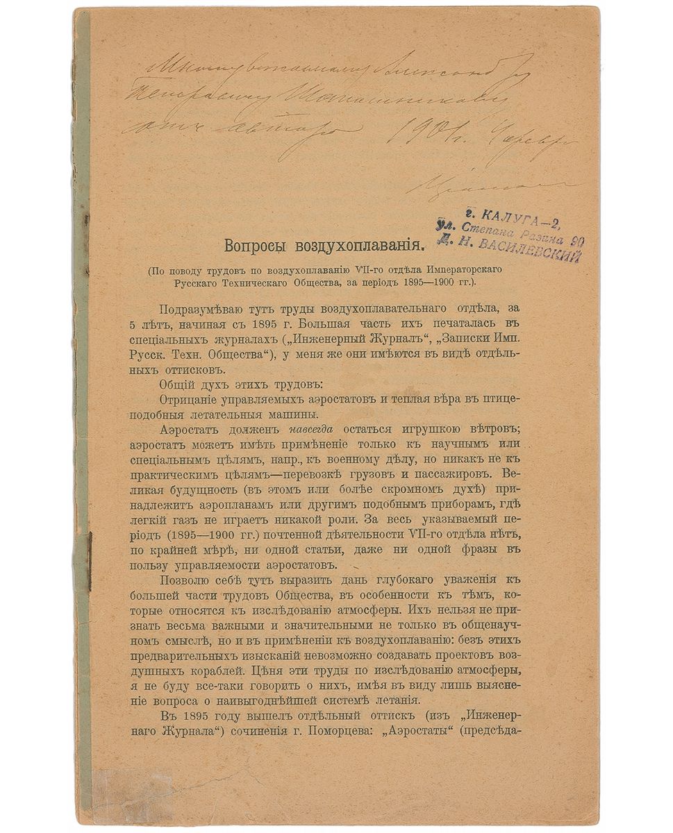 Russian physicist (1857–1935) who pioneered the study of rocketry and cosmonautics and whose discoveries were of crucial importance in the development of manned space travel. Booklet entitled ‘The Success of Aeronautics in the 19th Century,’ in Russian, 18 pages. Signed and inscribed at the top of the first page, also in Russian, with a three-line inscription dated 1901. In very good condition, with uniform toning to all pages, a stamp below signature, repaired tear to bottom of first page, and some scattered light foxing.