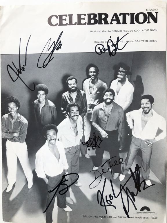 Kool & The Gang Celebration signed music sheet autographed by Robert "Kool" Bell, Ronald Bell, Dennis "D.T." Thomas, Robert "Spike" Mickens, Charles Smith, George Brown, and Ricky West. HL3655