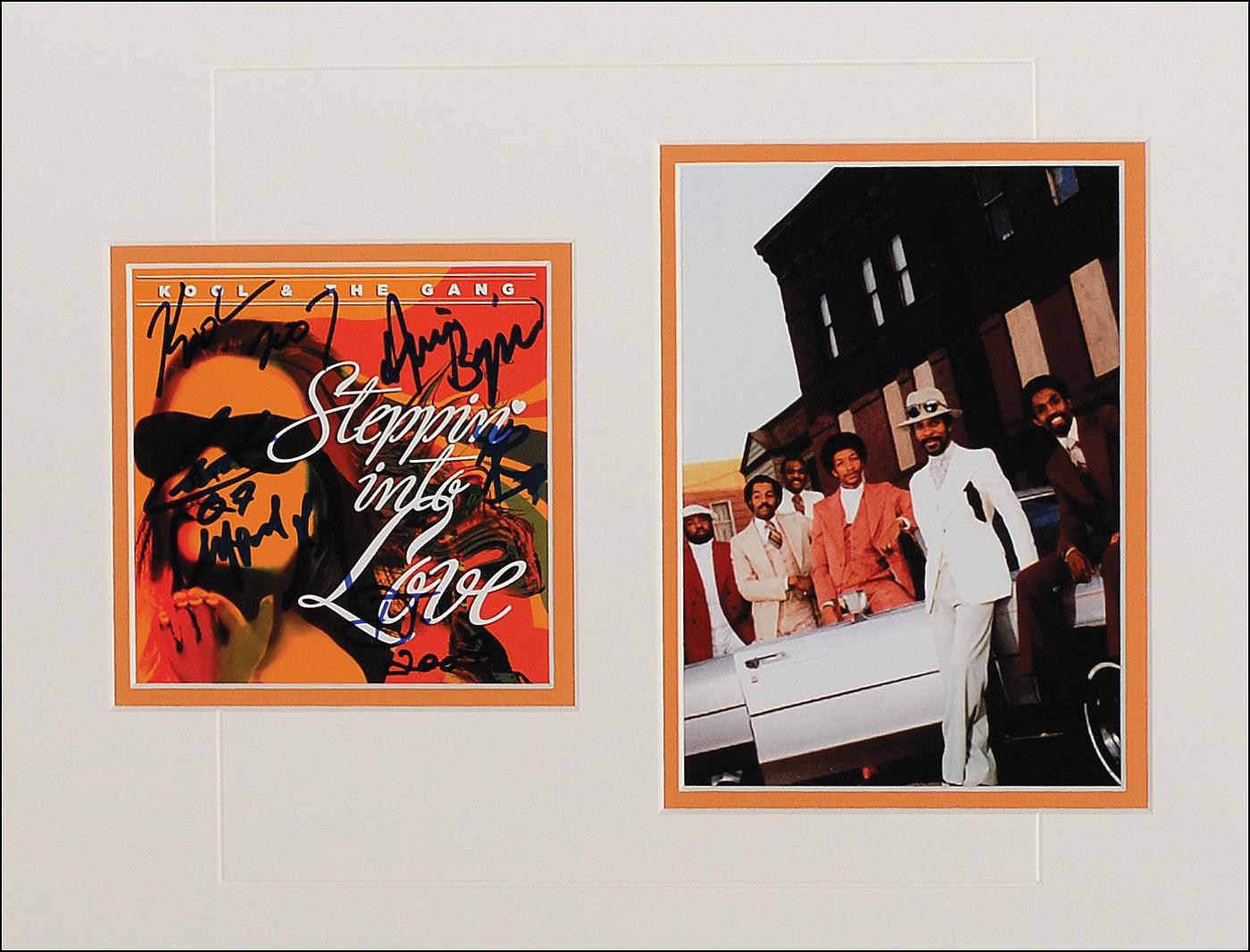 Steppin’ into Love CD booklet signed on the front in blue felt tip by Robert 'Kool' Bell, George Brown, Dennis Thomas, Clifford Adams, Curtis Williams, Amir Bayyan, and Michael Ray. Double matted with an unsigned photo of the band to an overall size of 14 x 11. In fine condition, with some moderate contrast to a few of the signatures.