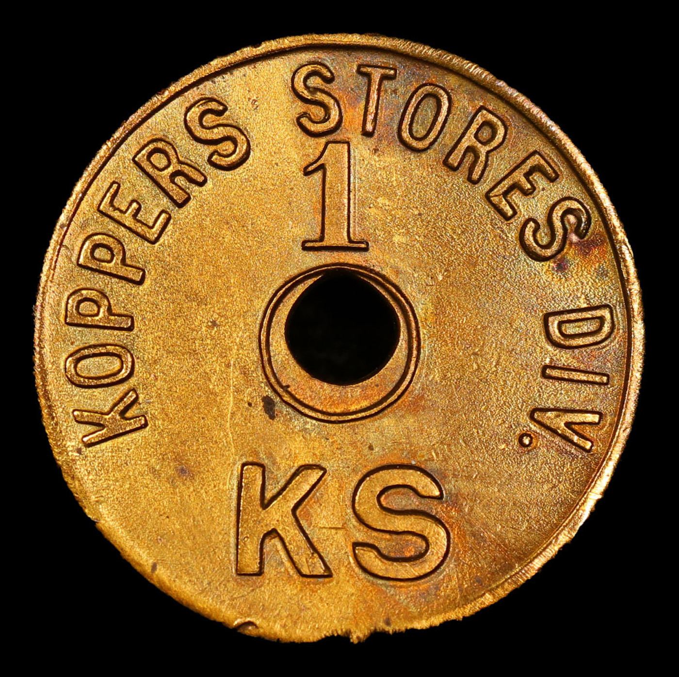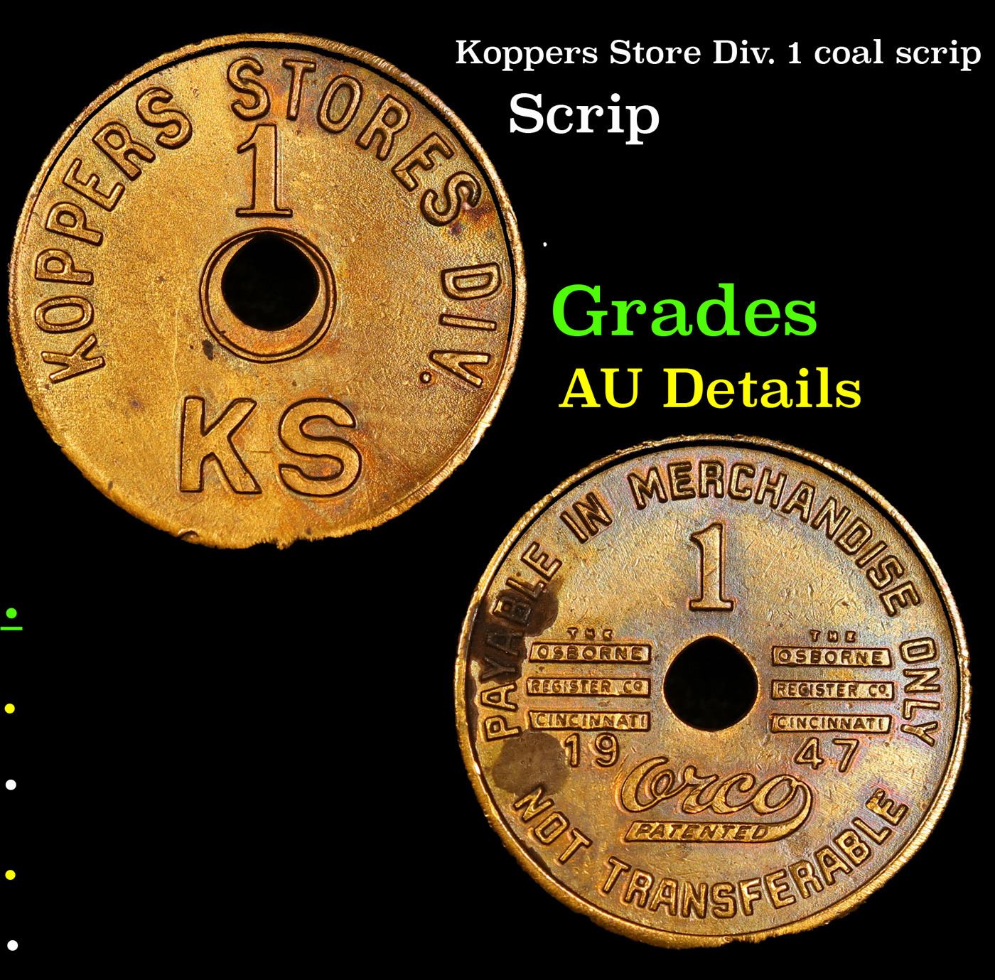 Koppers Store Div. 1 coal scrip Grades AU Details. This is a coal scrip belonging to The Houston Coal Company Store, also known as the Koppers Store, is an intact example of a coal company store, located at Carswell, West Virginia. Constructed in 1923, the Houston Coal Company Store, also known as Koppers Store, was added to the National Register of Historic Places in 1991 as one of the most unaltered remaining coal company stores in Southern West Virginia.