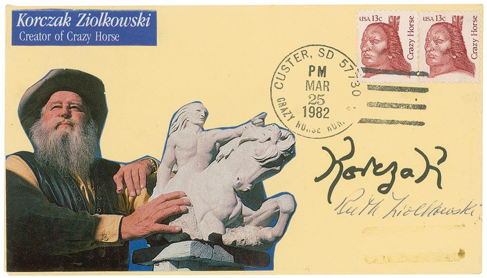 American designer and sculptor (1908–1982) of the Crazy Horse Memorial in South Dakota. Souvenir cover with two Crazy Horse postage stamps and clipped images of Ziolkowski and his Crazy Horse monument, signed in black felt tip by Ziolkowski and in blue ballpoint by his wife, Ruth. In fine condition, with adhesive residue at the bottom right corner. Accompanied by an ALS from Ruth Ziolkowski.