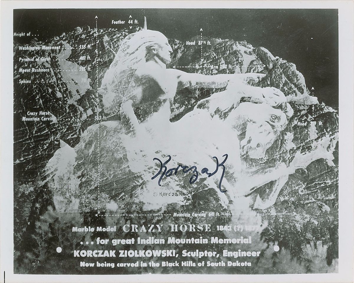 American designer and sculptor (1908–1982) of the Crazy Horse Memorial in South Dakota. Uncommon glossy 10 x 8 photo depicting the dimensions of the 563-foot tall Crazy Horse Memorial, signed in black felt tip, “Korczak.” In fine condition, with trivial creasing.