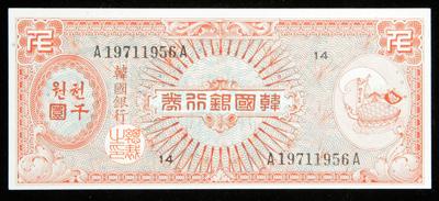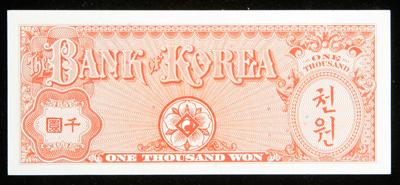 Korea. 1 Won, 5 Won (2 notes), 10 Won, 100 Won and 1000 Won, ND (1953). P-11, 12, 13, 14, 15 (Scarce). Lot of 6 notes. 1000 Won Extremely Fine, balance of lot Very Fine.