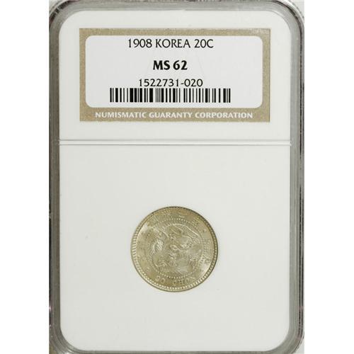 <B>Yung Hi 20 Chon Year 2 (1908), </B></I>KM1140, MS62 NGC, a nice lustrous coin with some typical marks in the reverse fields.<BR><BR><b>Shipping:</b> Coins & Currency (<a target="_blank" href="http://www.heritageauctions.com/common/shipping.php">view shipping information</a>)