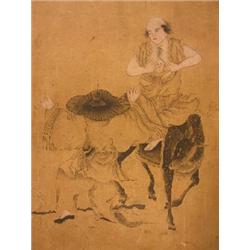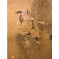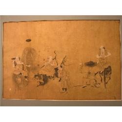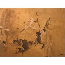 A very finely detailed painting on paper of a Buddhist nature depicting monks and mythical animals. Good condition with some minor staining to background. Korea, 17th C. 19 1/2" (49.5 cm) x 12 3/4" (32.5 cm).