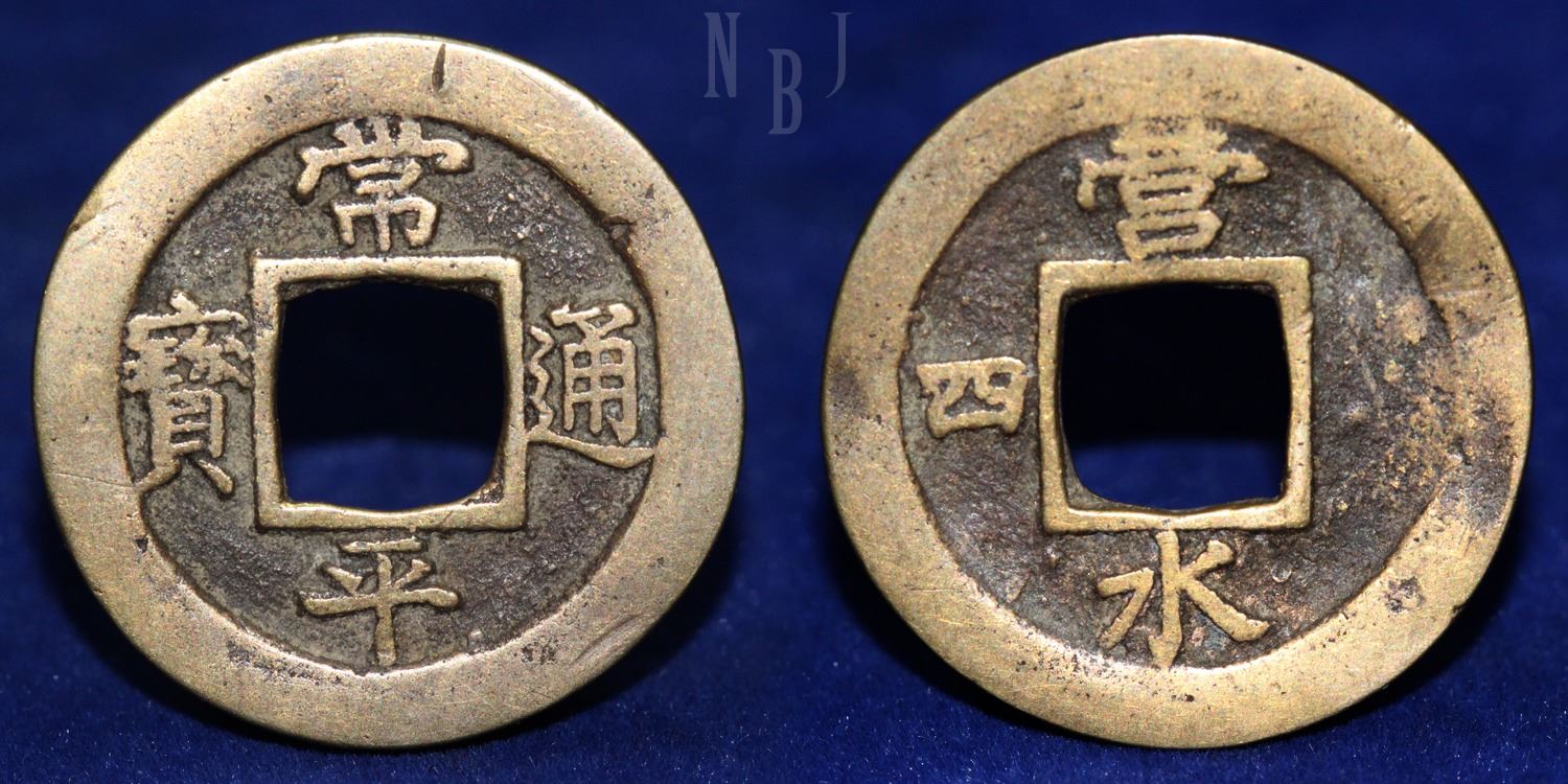 Korean AE Coin, Sang Pyong Tong Bo, 1752 AD. Obv: Sang Pyong Tong Bo, cursive script TONG. hooks in PYONG. Rev: above YONG, left 4, below SU (water). (4.75gm, 28mm) Near Extremely Fine.