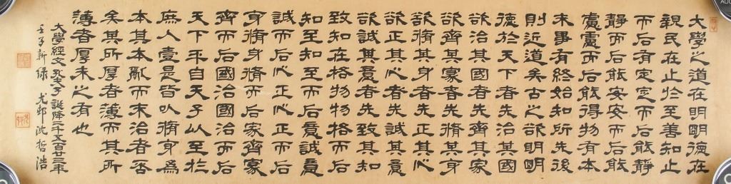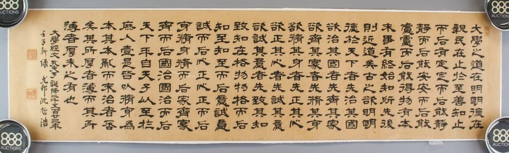 Korean ink on paper. Featuring calligraphy in Han characters. Signed. Inscribed with three seals. 30 x 119 cm..