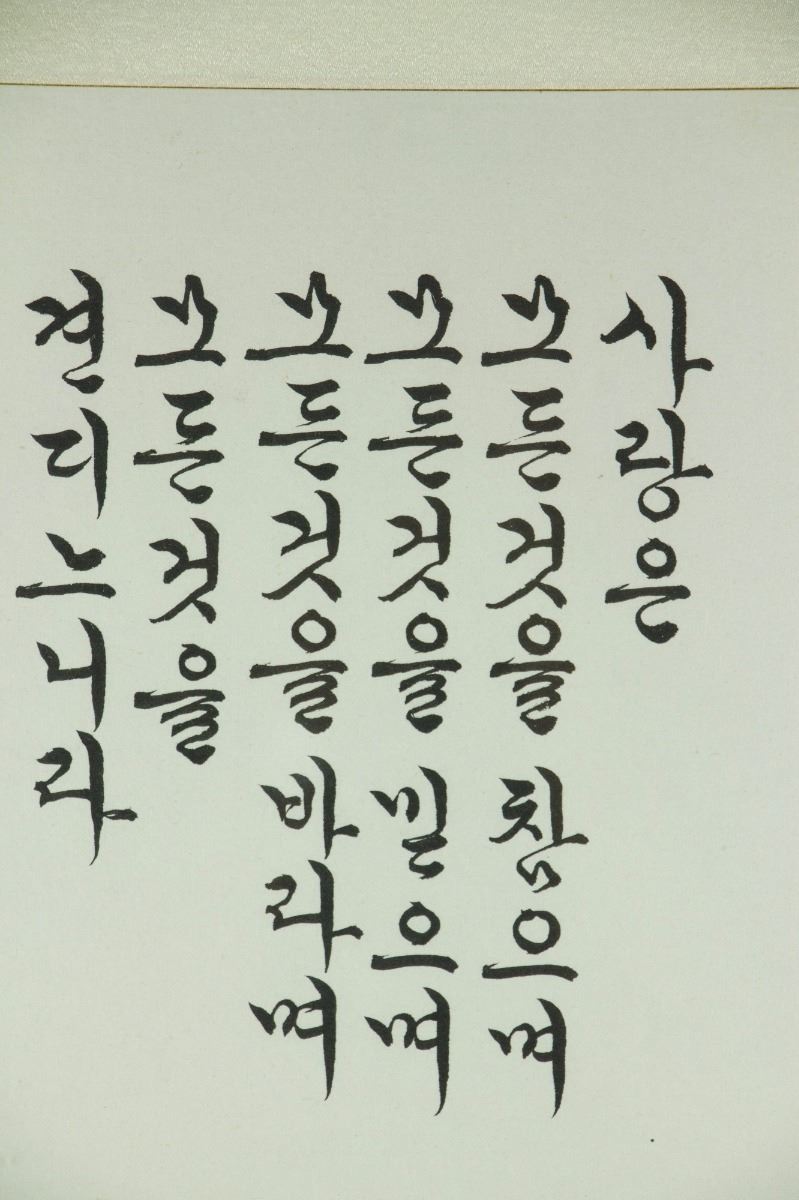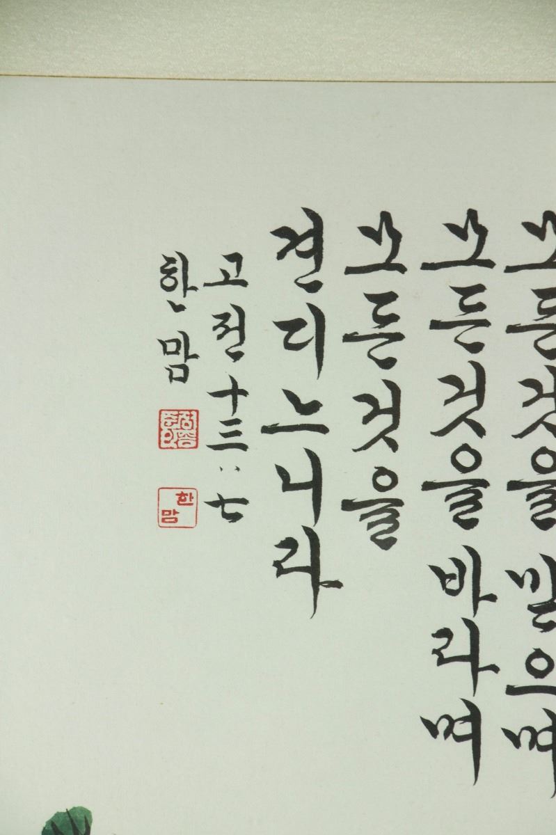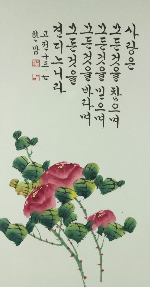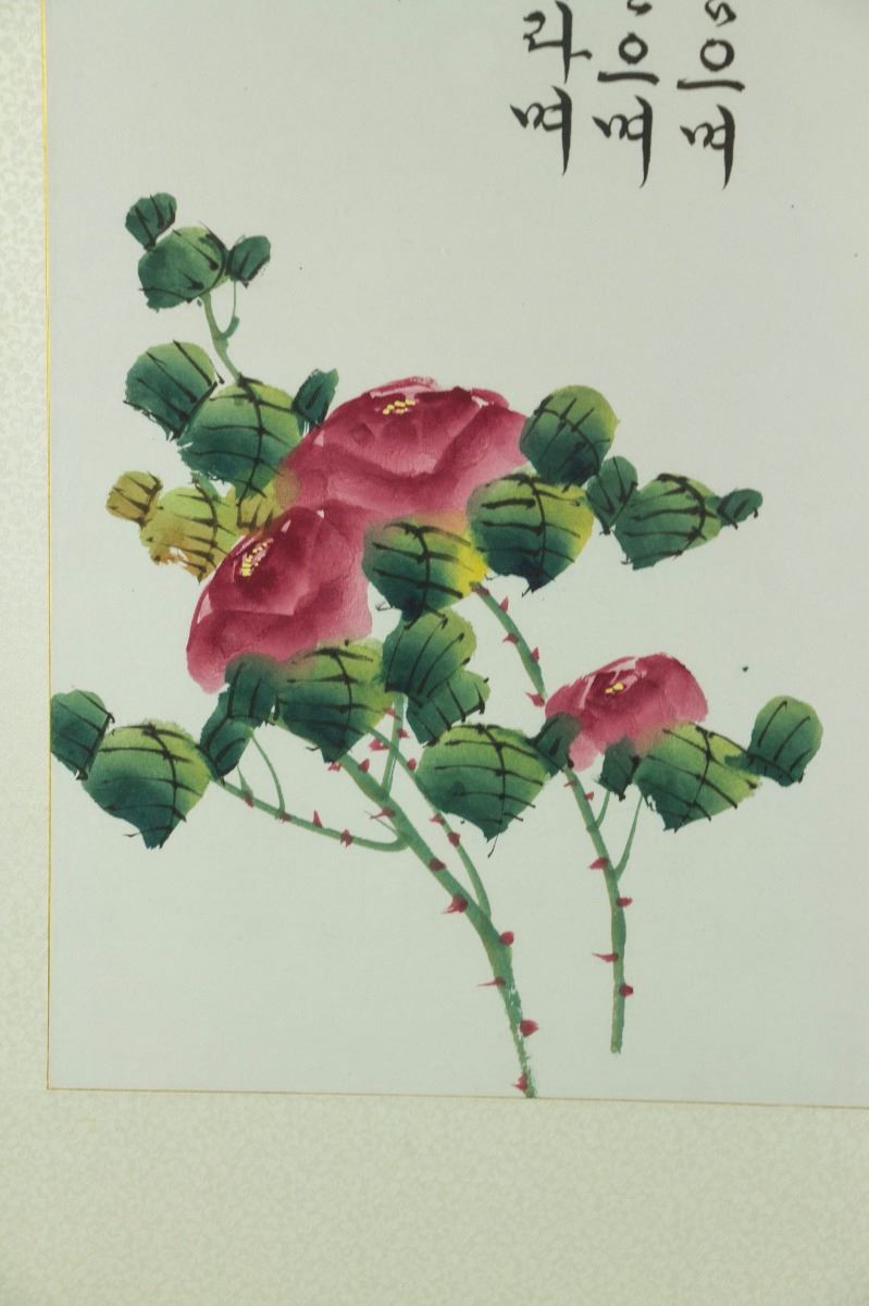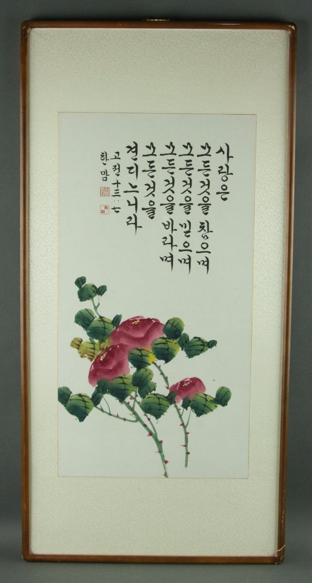 Korean Calligraphy with Rose; Ink on paper; with frame; signed by artist; inscribed with two artist seals; 62.5 cm × 32.5 cm