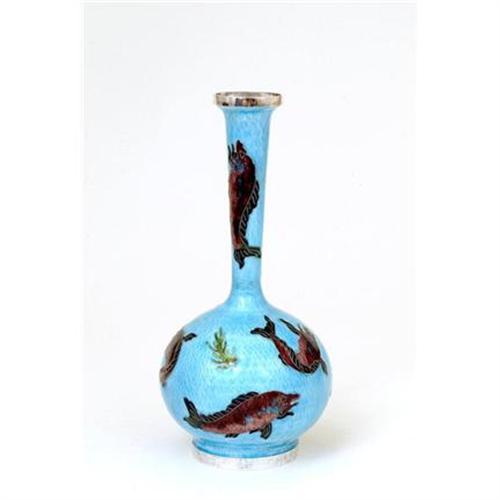 Korean Cloisonne Silver Vase in Japanese Ginbari Style Marked "Silver 99%" with Original Box