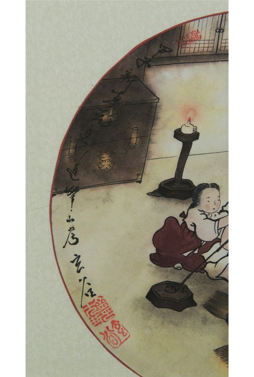 Grandfather and child, framed, ink and watercolour painting, signed and sealed. D: 24.5 cm.