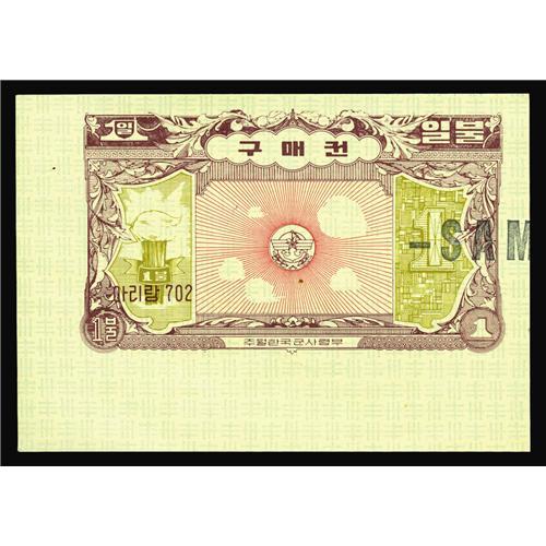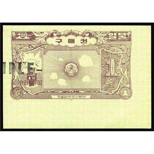 <B>Korean MPC Coupon Series 2 (702) $1 with "SAMPLE" Overprint Schwan 975x3 Gem New.</B></I> This is another "SAMPLE" coupon with the extra selvedge due to its being from a sheet corner position. A tiny spot is near the center of the face.
