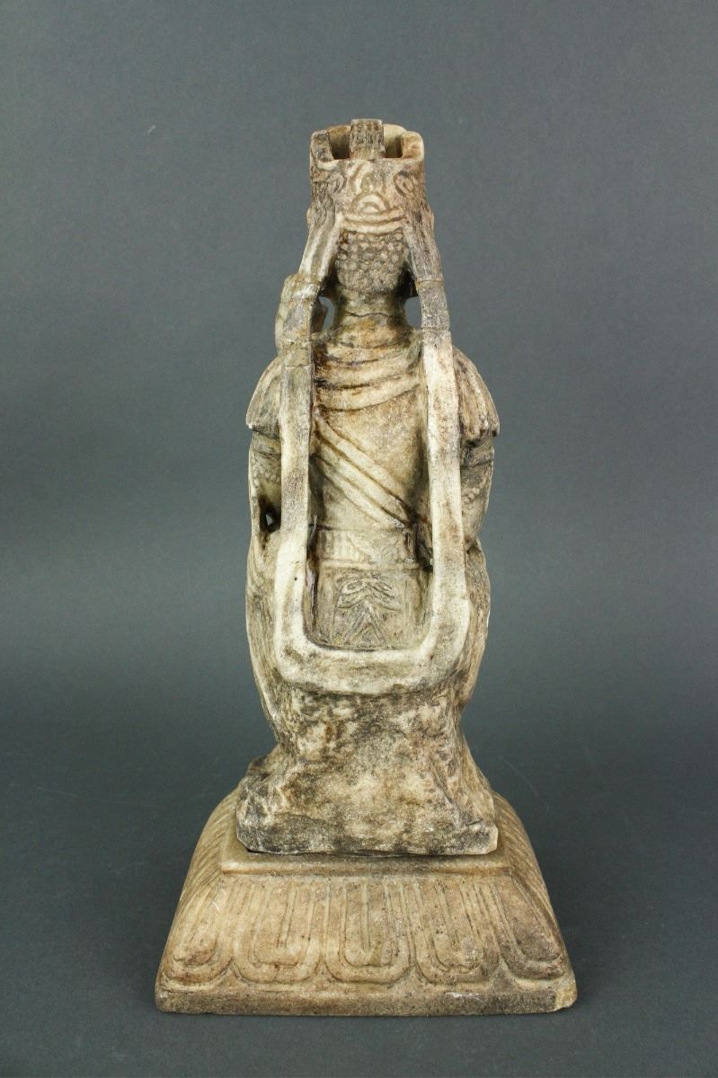 Rare seated marbel figure of Kwan-um Bosal, Goreyo Dynasty; 10th to 12th century; in the posture of Royal ease with sanghati robe and fringed with jewels; the hands in abhaya mudra; the base with in inserted tablet and raised on a separate fine grained granite lotus base; chipped on one corner of the base; H: 20.5 cm, W: 14 cm, 2741 grams