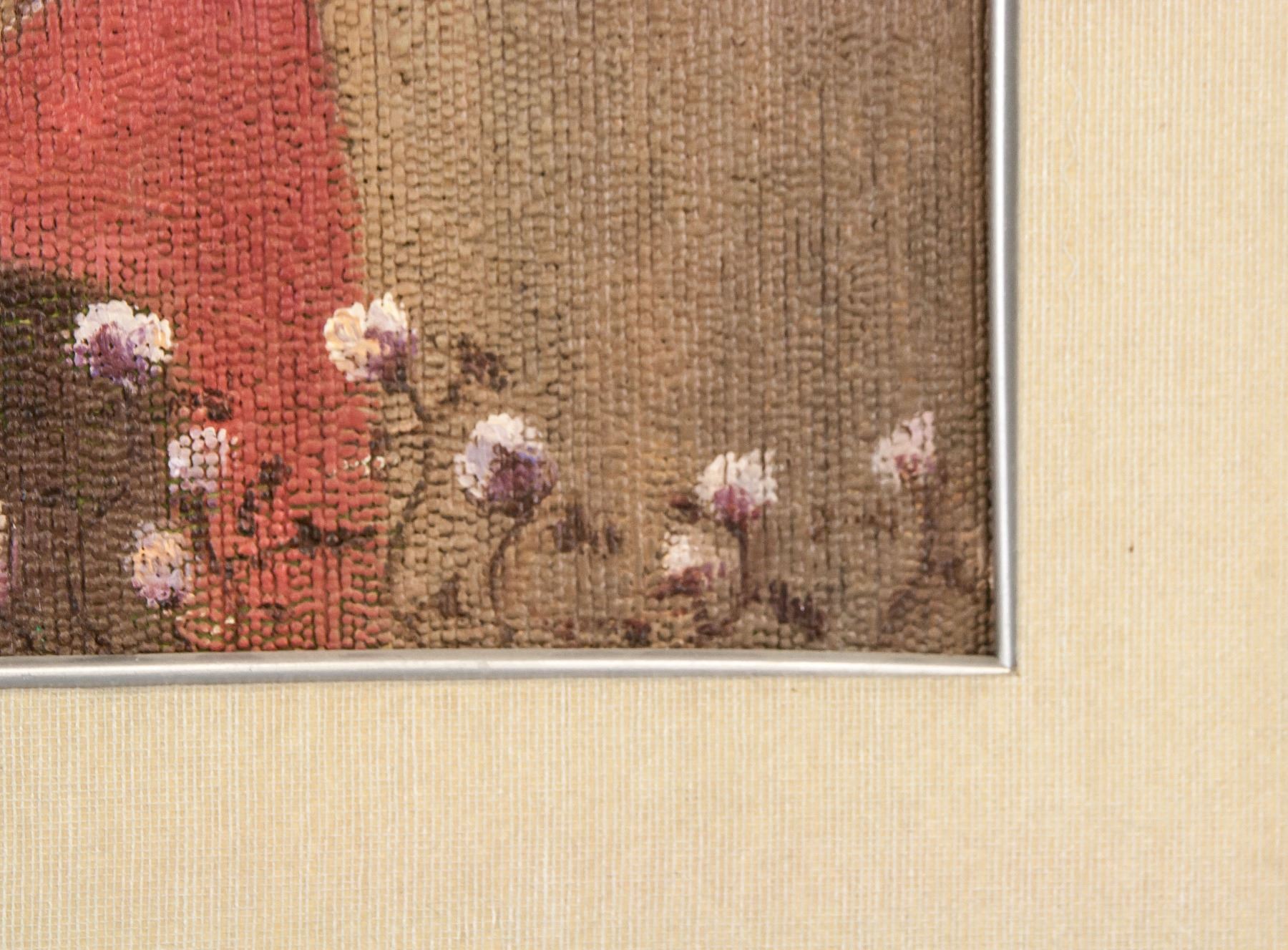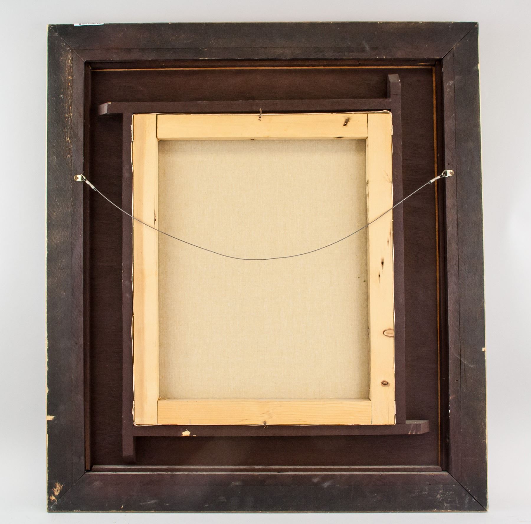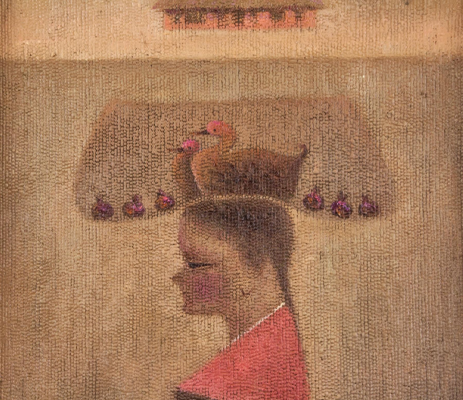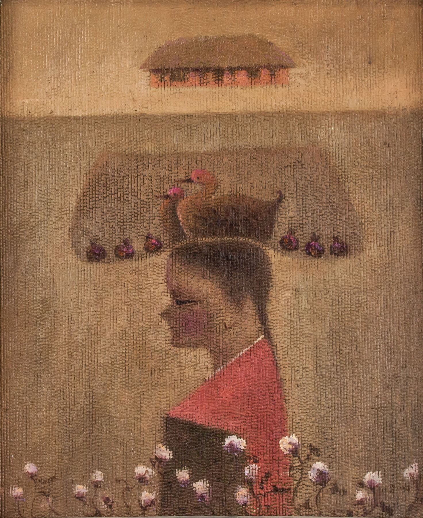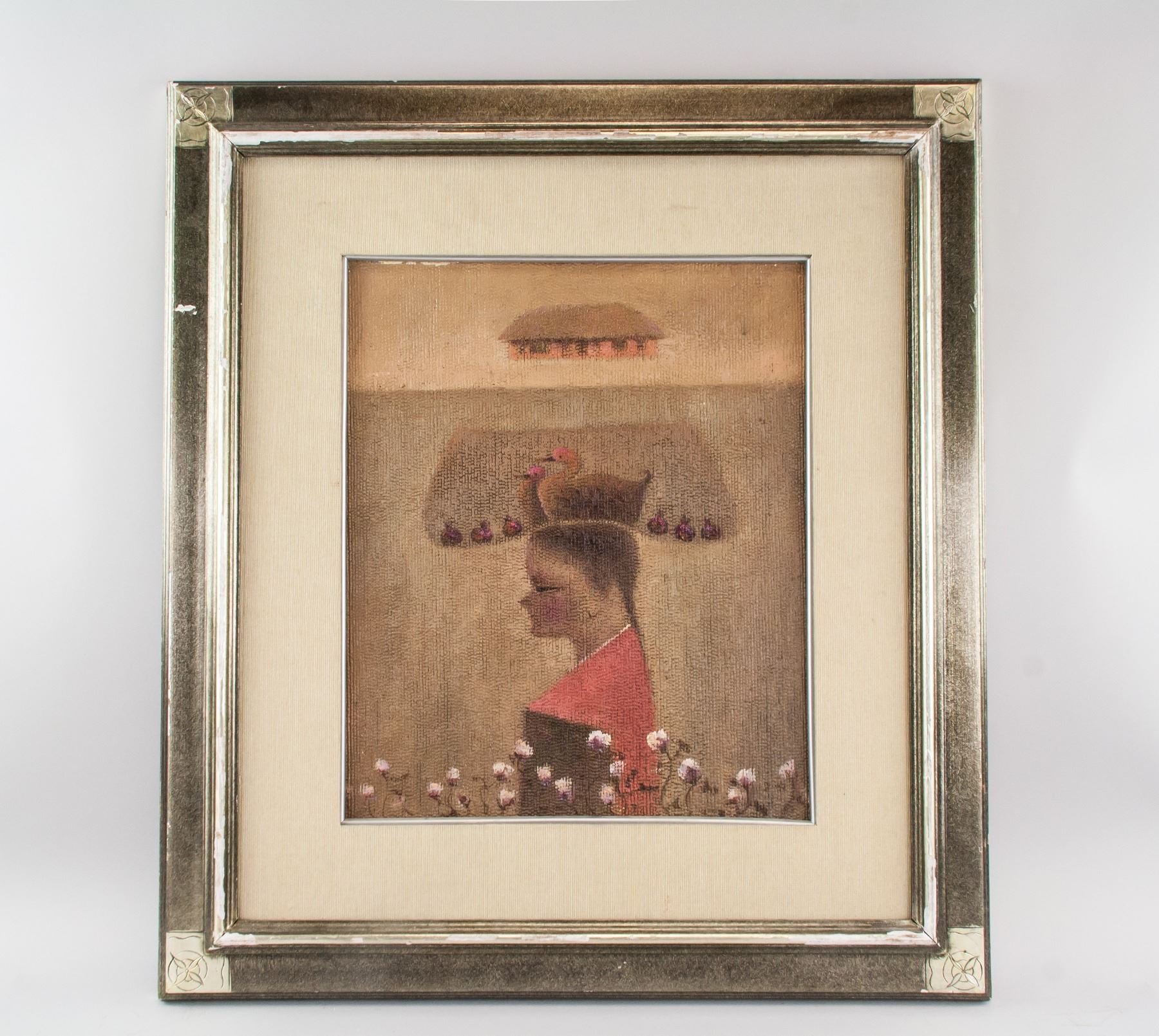 Oil on canvas painting, featuring a profile of Korean woman in traditional dress leaving the home after marriage with a pair of Mandarin ducks above her head signifying auspiciousness, love and marriage, unsigned, Circa 1970, 17.5 x 14.5 inch (44.45 x 36.83 cm). PROVENANCE: Private collection, Toronto, ON