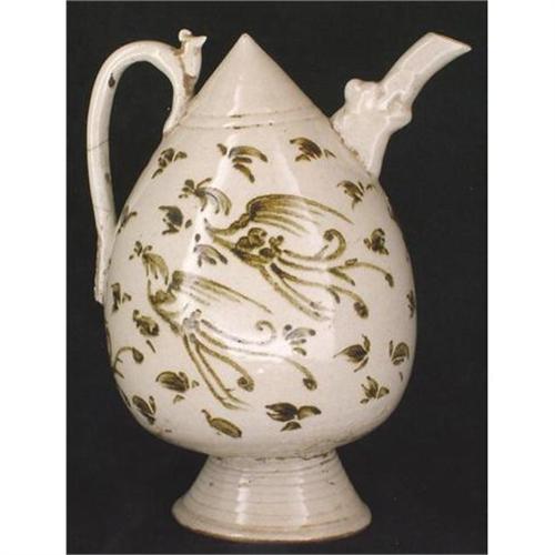 A very fine and unusual pear-shaped Korean Ewer with underglaze cobalt-blue design. We attribute this ewer to the 15th/17th century, Choson. The ewer has an auspicious pear-shape with an elephant spout and a long and delicate looped handle that has a small bird at the top curl. The ewer sits a little askewed on its splayed foot. This is ewer is quite unique not only for its pear shape body that stands on a tall splayed foot. But that the vessel fills from the bottom! The ewer was made with an inverted core-fill. This is much like an inverted cone that was formed above the foot and on the inside of the ewer. There is an opening in the center of the foot that allows liquid to enter. We believe the vessel was filled in an upright position by submersion. The liquid will percolate up into the ewer and stop when it is filled. Another possible way to fill the ewer is to turn it on its side and pour the liquid in. Though this manner of filling only fills no more than about half the ewer and is messy. We believe the submersion method seems much more likely the manner the ewer was filled as this method permitted the most amount of liquid to enter and stay in the ewer. This pear-shape ewer is decorated in underglaze cobalt-blue Phoenix's and clouds circumventing the body. Interestingly the blue glaze turned an olive-green in the high firing process. Underglaze blue was first introduced by the Chinese during the Late Song dynasty to Early Yuan dynasty, A.D.13th/14th century. This was adapted ...