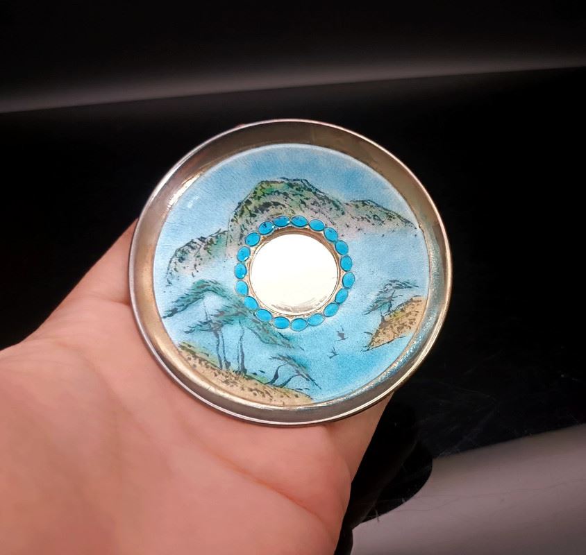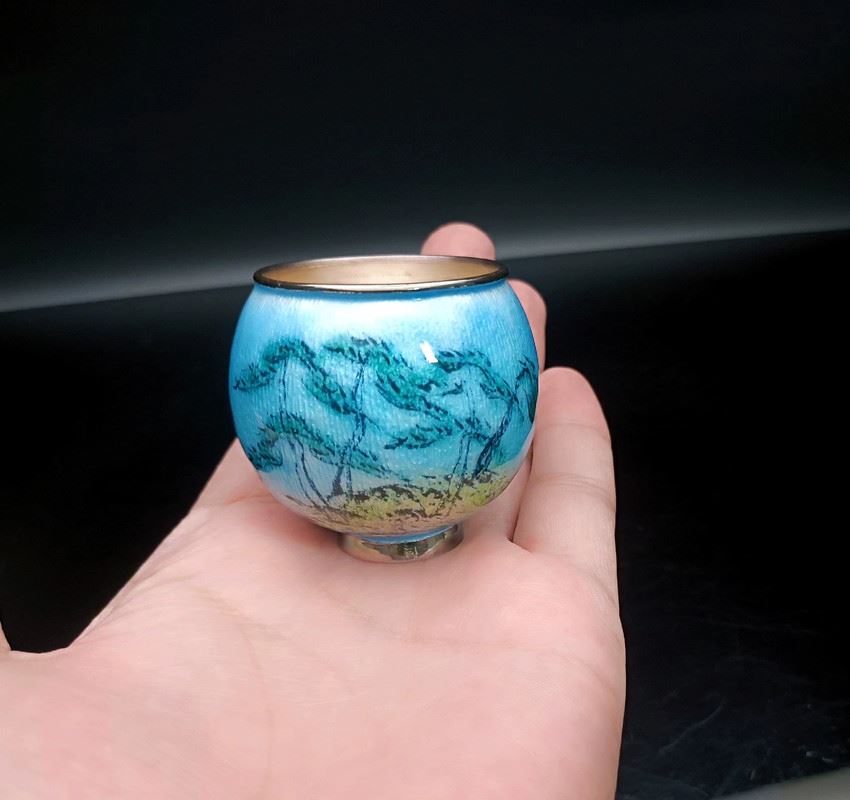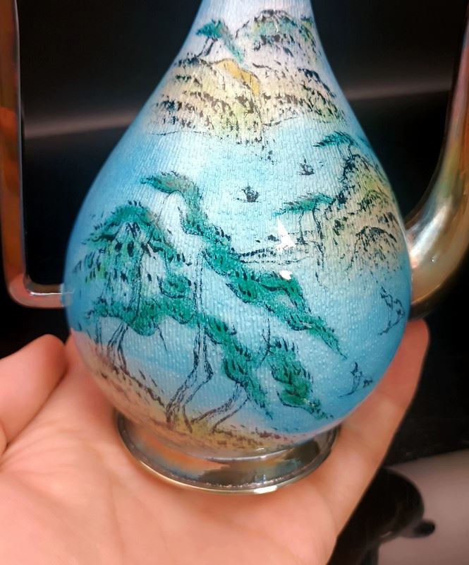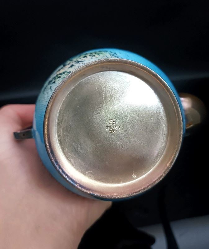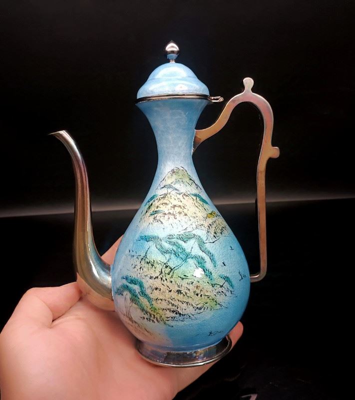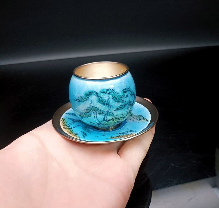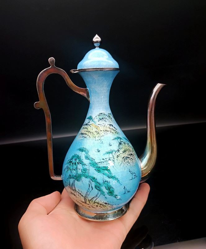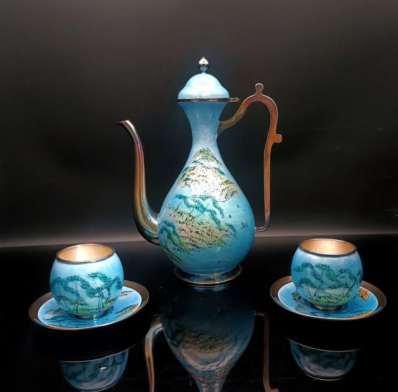 This Korean silver cloisonné tea set features exquisite silver craftsmanship and traditional cloisonné enamel techniques. The teapot is made of silver with a vibrant blue cloisonné enamel surface, adorned with delicate floral and bird patterns in rich colors, bringing the piece to life. The design of the teapot is elegant and unique, paired with two cloisonné teacups and saucers, creating a refined and noble aesthetic. Every piece is meticulously crafted, with attention to detail, showcasing the fusion of traditional Korean metalwork and artistic craftsmanship. This set is not only functional but also holds significant collectible and artistic value.