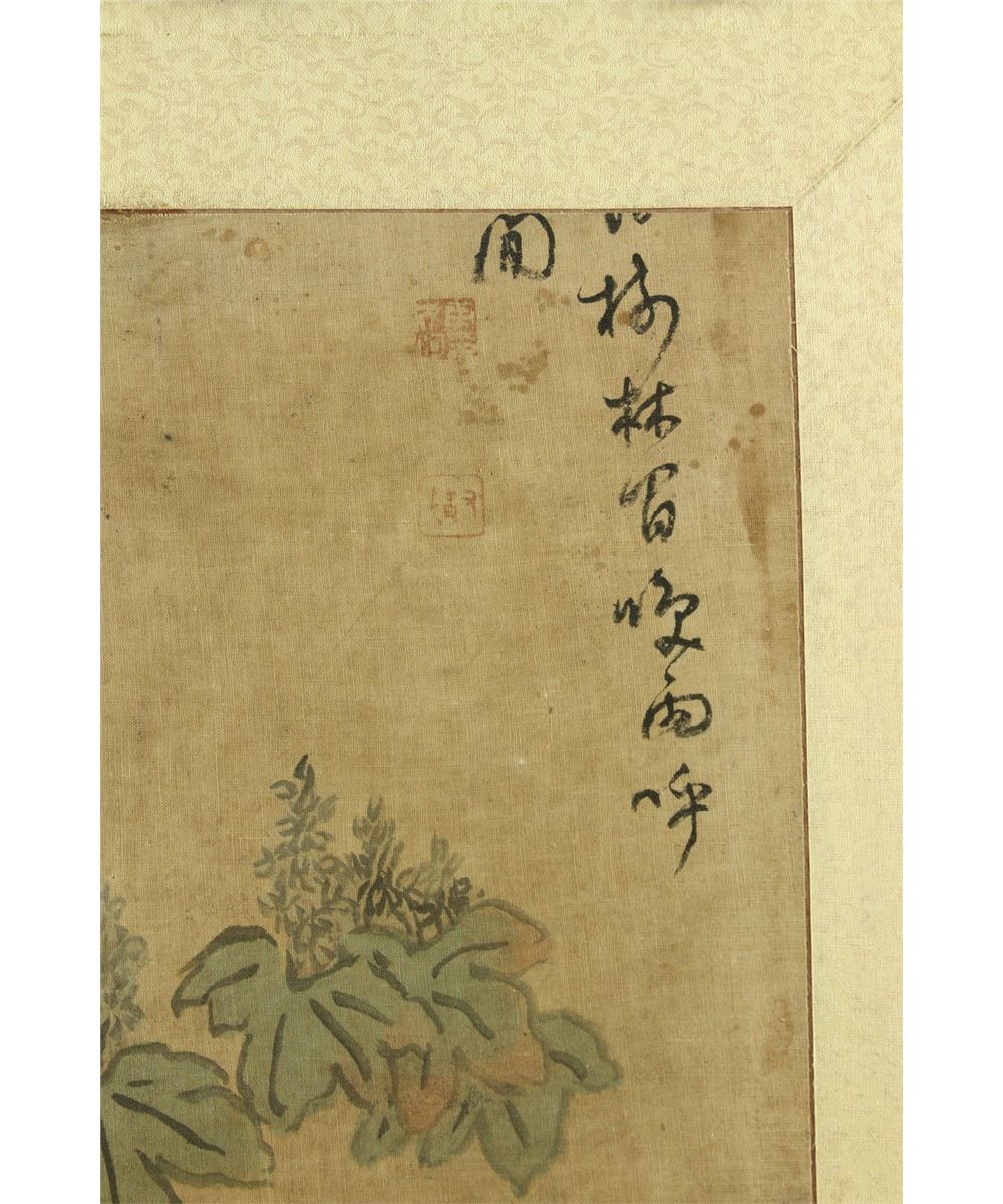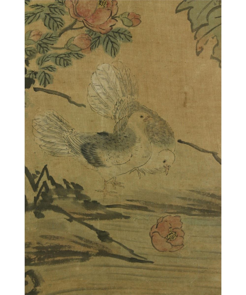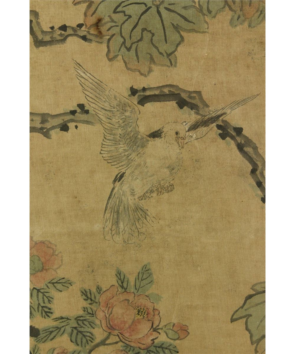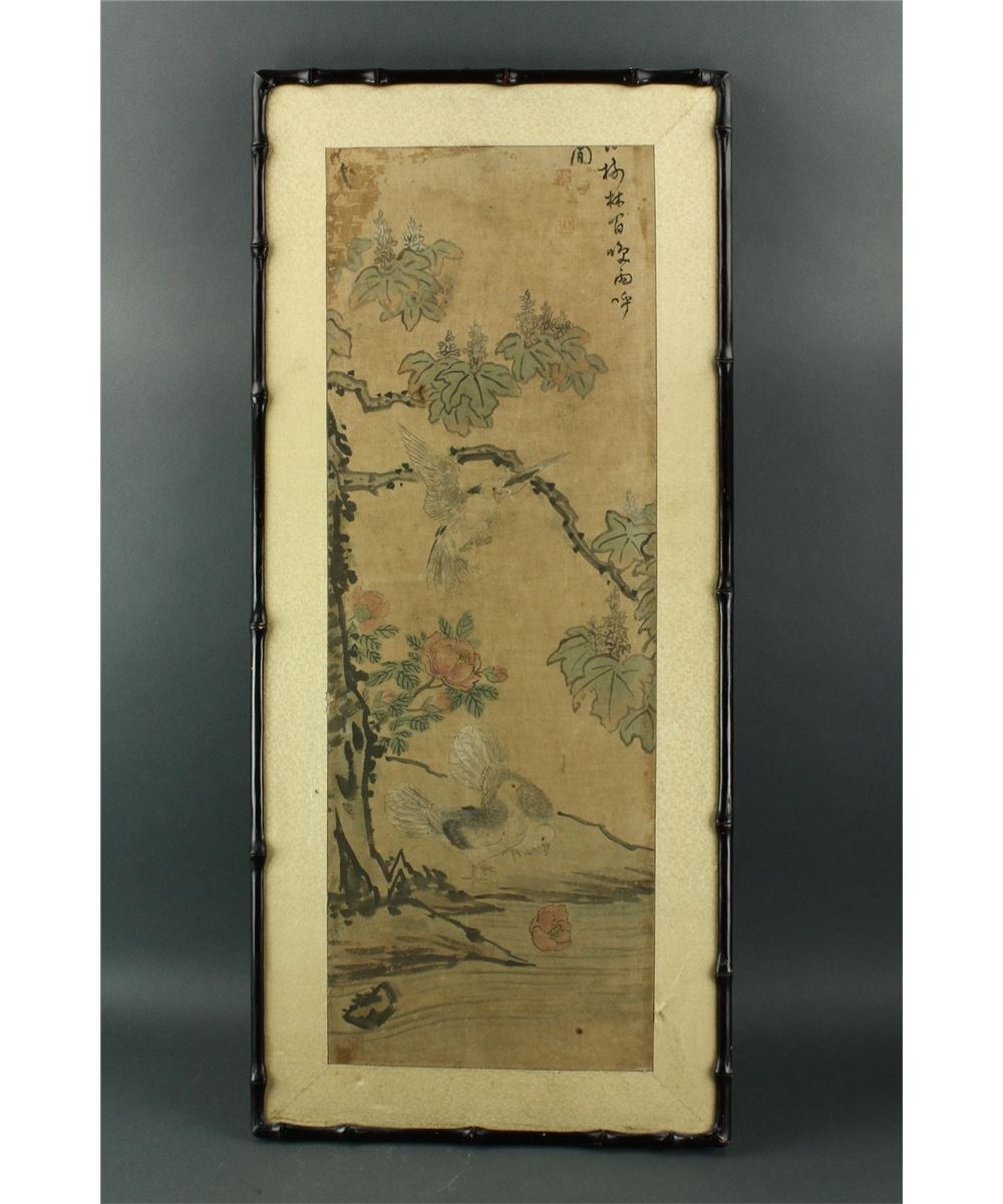 Flowers and birds; Korean ink and watercolour on silk; framed; signed and inscribed with two artist seal; 100 cm X 44 cm