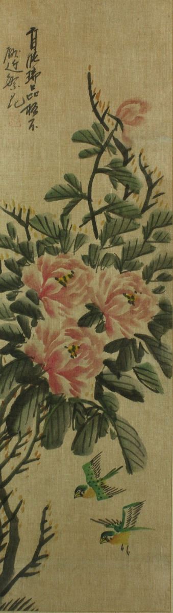 Peonies and birds; Korean ink and watercolour on silk; framed; signed and inscribed with one artist seal; 105 cm X 38 cm
