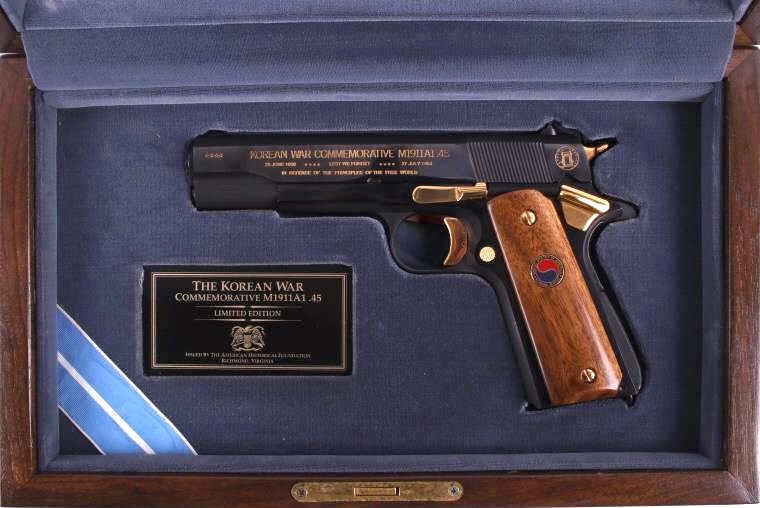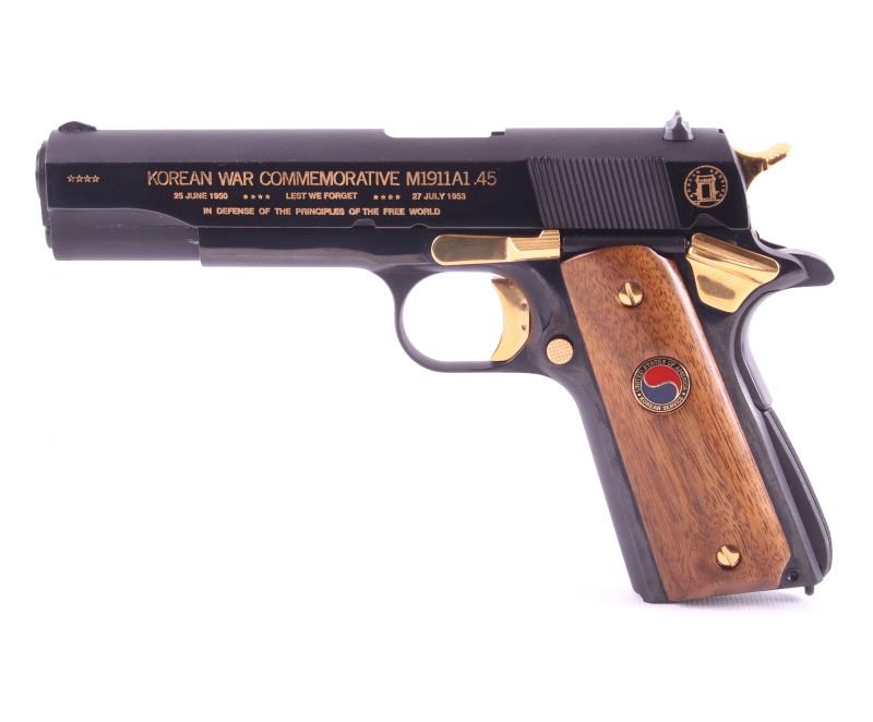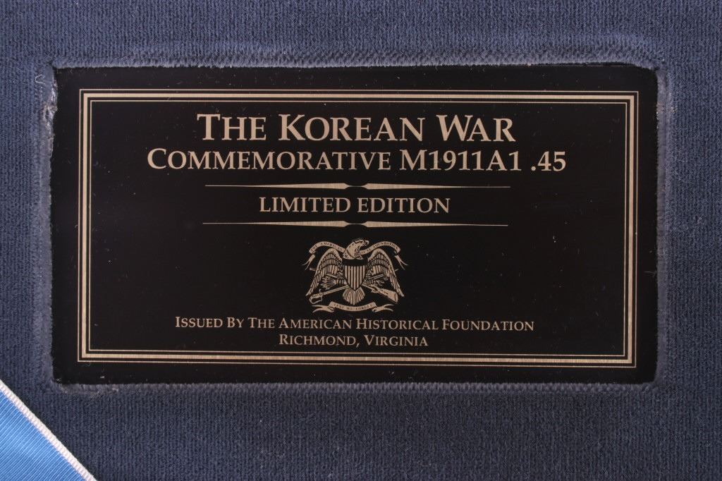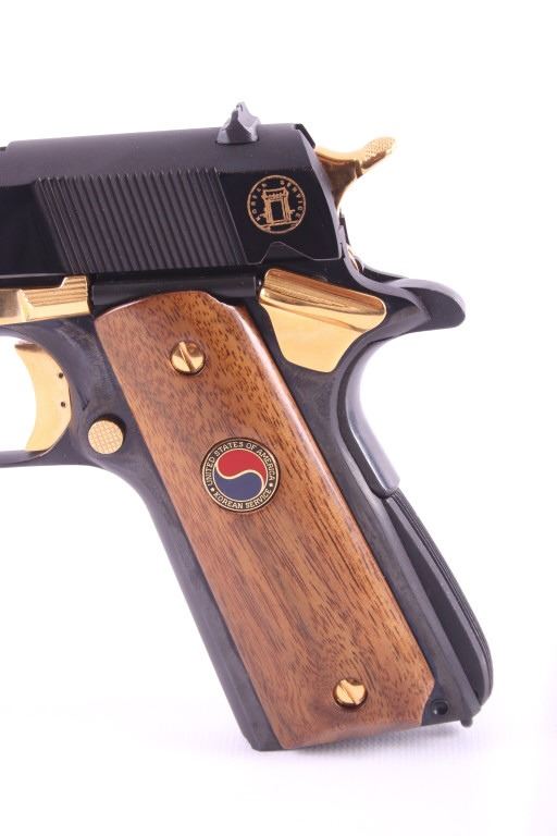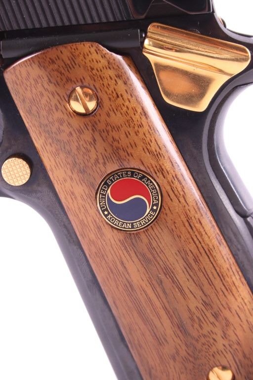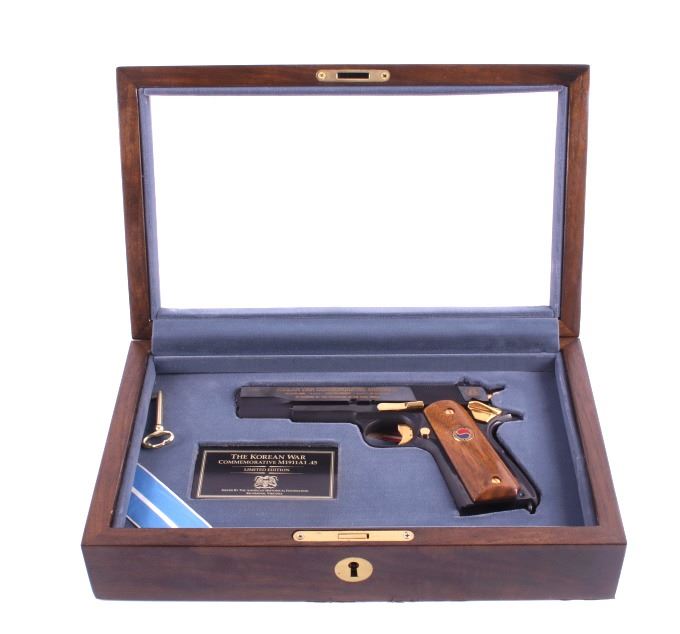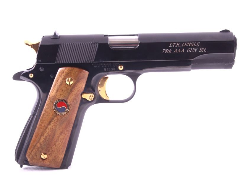 For your bidding pleasure is a Korean War Commemorative M1911 A1 in .45 ACP. Issued by the American Historical Foundation this unfired M1911 A1 features gold accents and stamped gold lettering. Straight grain walnut stocks incorporates a Korean Service seal on each grip. The barrel is gold stamped " KOREAN WAR COMMEMORATIVE M1911A1 .45 - 25 June 1950 - LEST WE FORGET - 27 July 1953 - IN DEFENSE OF THE PRINCIPLES OF THE FREE WORLD" the reverse side of the slide reads " L.T.R.J.ENGLE - 78th AAA GUN BN." The colt has a fixed front sight and adjustable rear, and serrated gold trigger. Colt is in mint condition, action is tight and bluing is pristine. The commemorative box is constructed from straight grain walnut and is embossed in light blue felt. Measures 14" x 8.5" x 3.5". This pistol qualifies as a Curio & Relic Long Gun, and requires FFL Transfer or NICS Background Check. Serial Number: KW 136