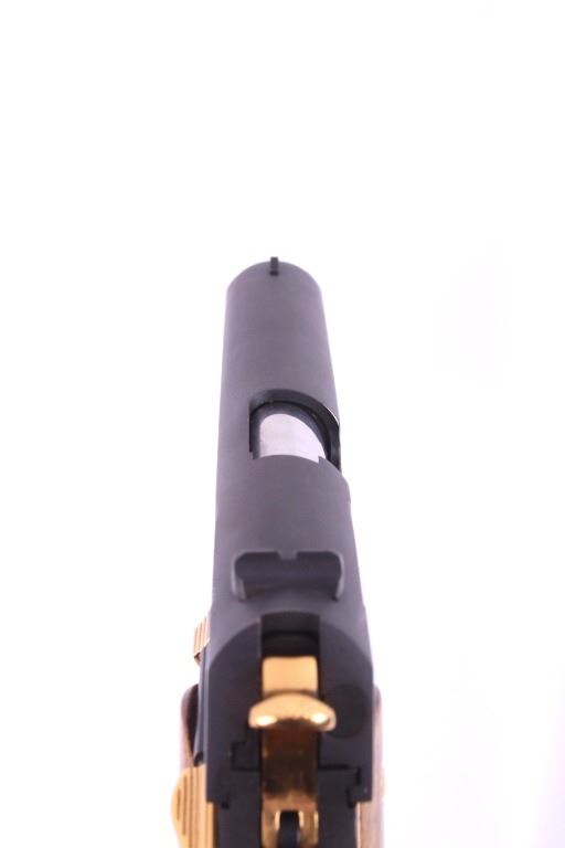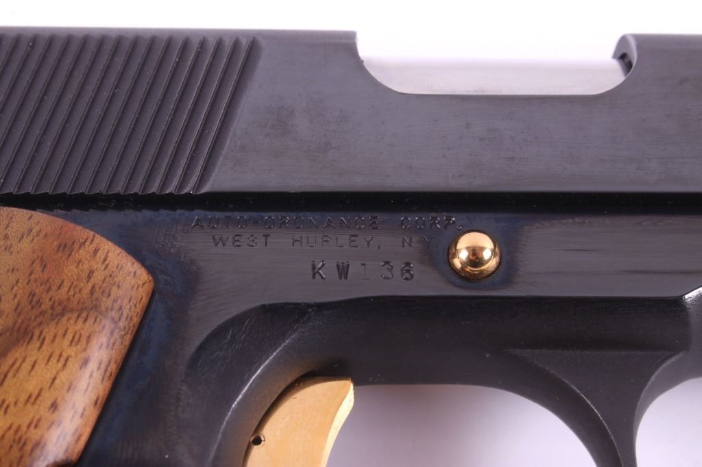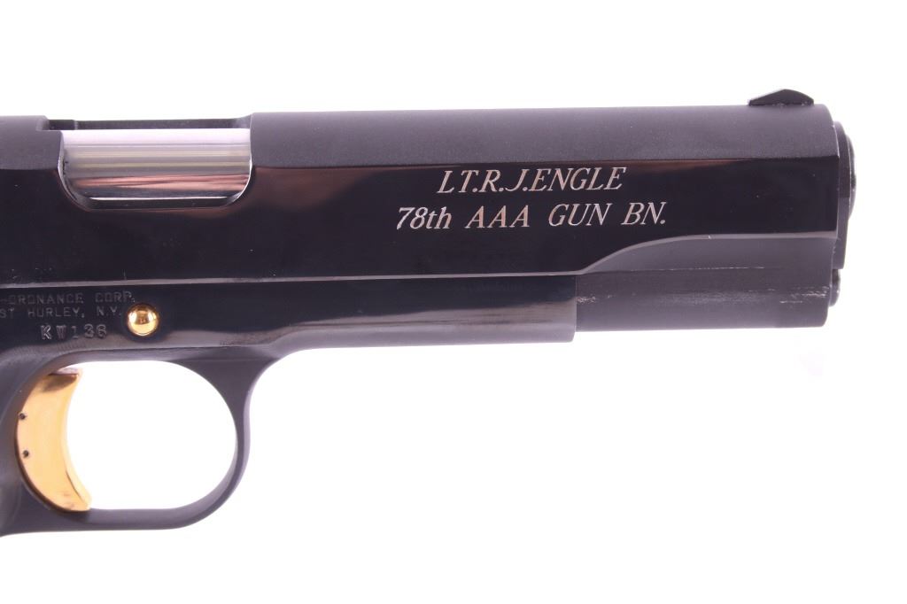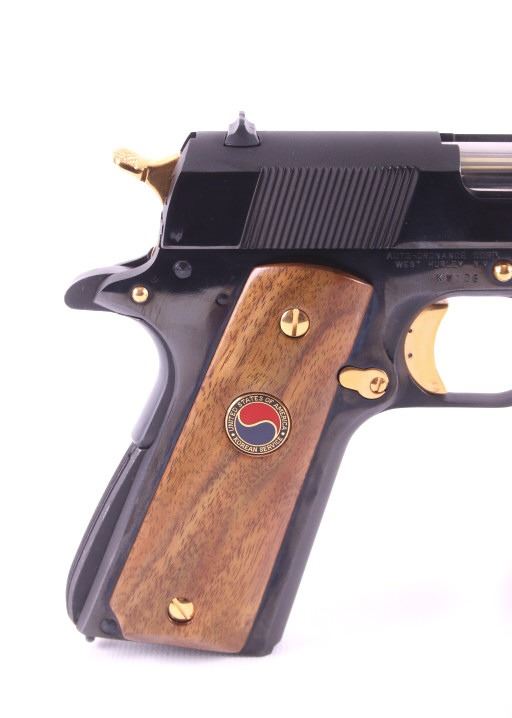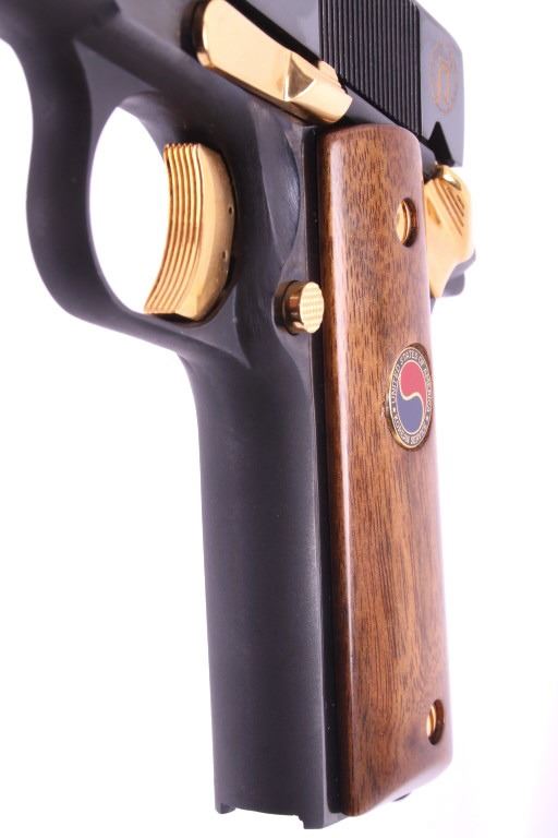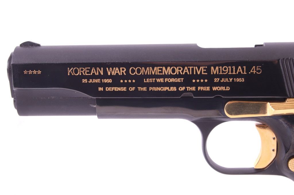 For your bidding pleasure is a Korean War Commemorative M1911 A1 in .45 ACP. Issued by the American Historical Foundation this unfired M1911 A1 features gold accents and stamped gold lettering. Straight grain walnut stocks incorporates a Korean Service seal on each grip. The barrel is gold stamped " KOREAN WAR COMMEMORATIVE M1911A1 .45 - 25 June 1950 - LEST WE FORGET - 27 July 1953 - IN DEFENSE OF THE PRINCIPLES OF THE FREE WORLD" the reverse side of the slide reads " L.T.R.J.ENGLE - 78th AAA GUN BN." The colt has a fixed front sight and adjustable rear, and serrated gold trigger. Colt is in mint condition, action is tight and bluing is pristine. The commemorative box is constructed from straight grain walnut and is embossed in light blue felt. Measures 14" x 8.5" x 3.5". This pistol qualifies as a Curio & Relic Long Gun, and requires FFL Transfer or NICS Background Check. Serial Number: KW 136