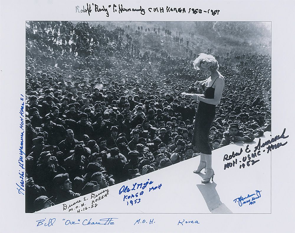 Satin-finish 14 x 11 photo of Marilyn Monroe performing at a USO show, signed in blue and black felt tip by Rudolfo Hernandez, Bill ‘Doc’ Charette, Duane Dewey, Hiroshi Miyamura, Robert Simanek, Thomas Hudner, and Ola Lee Mize. In very fine condition.