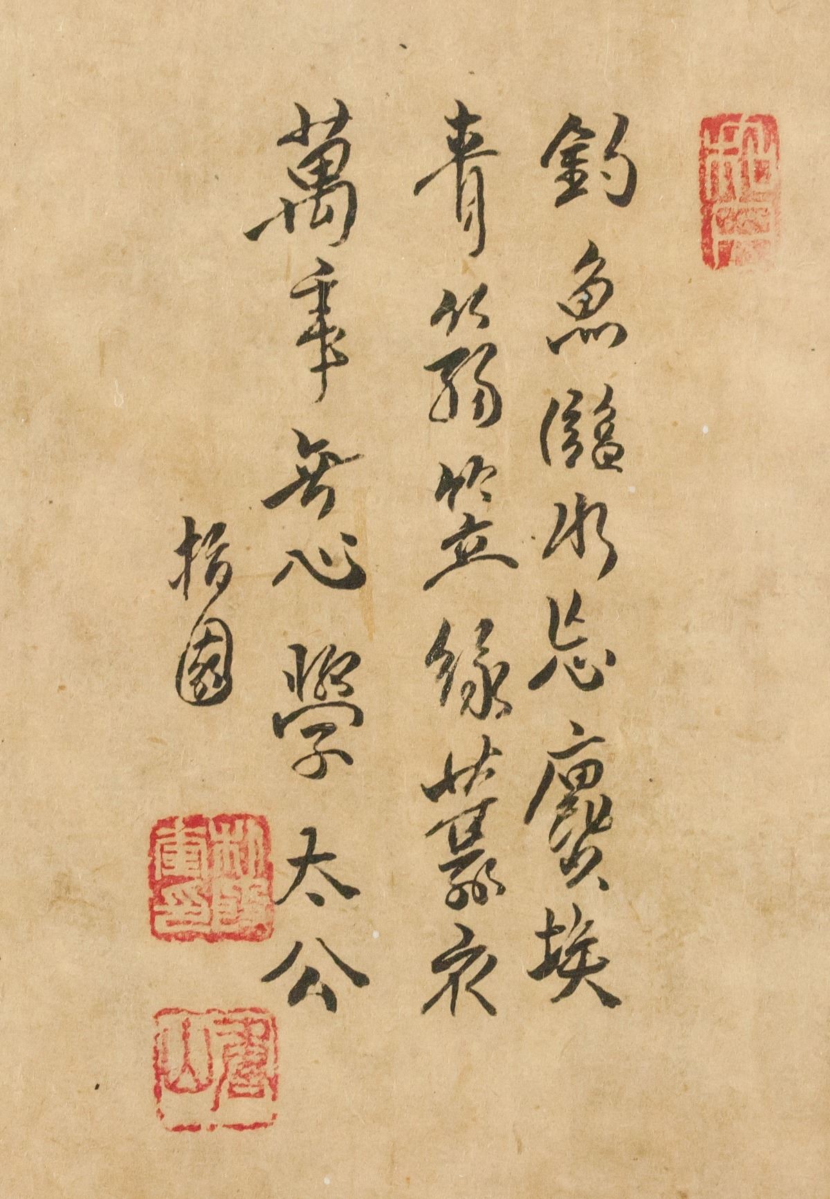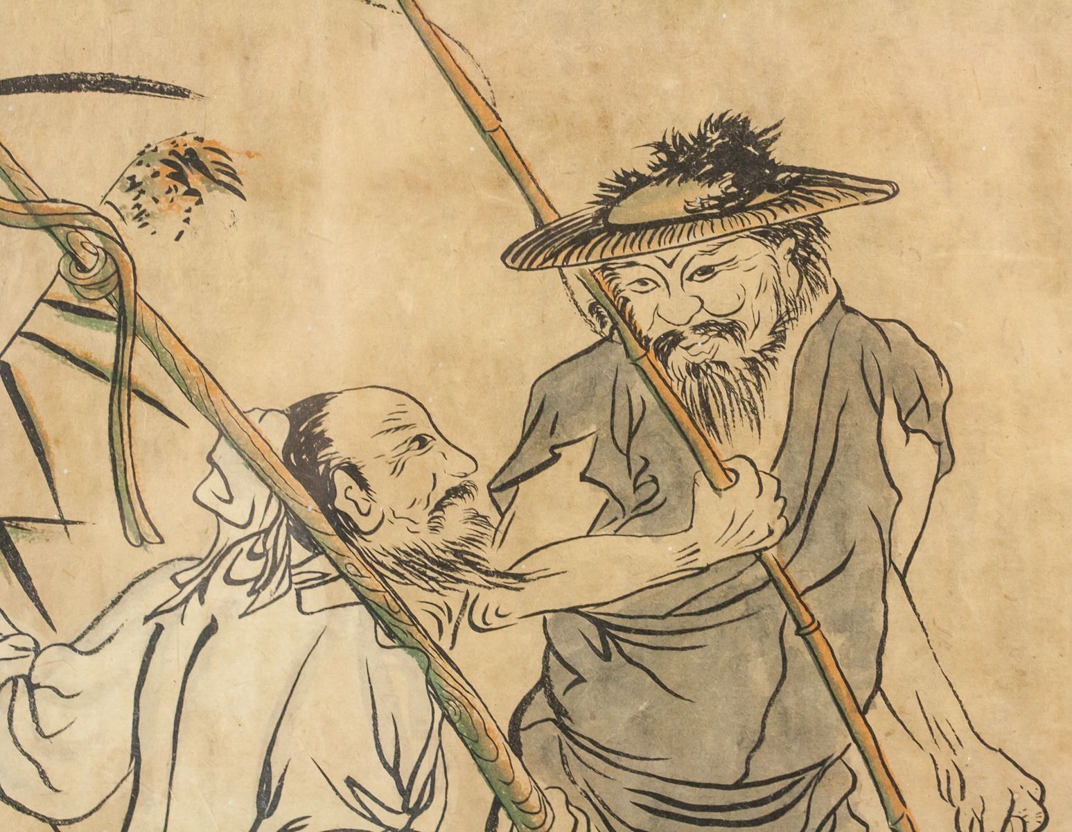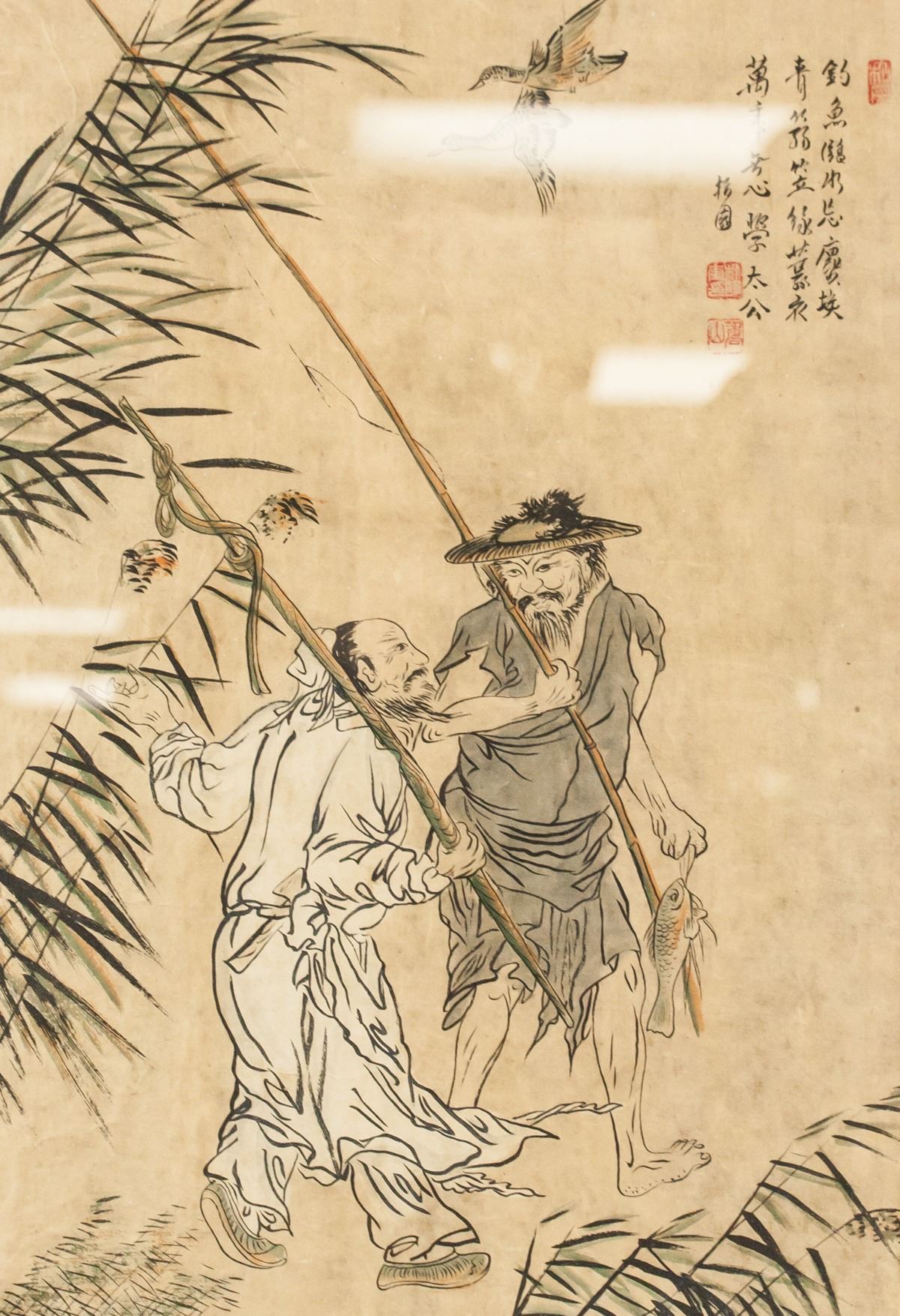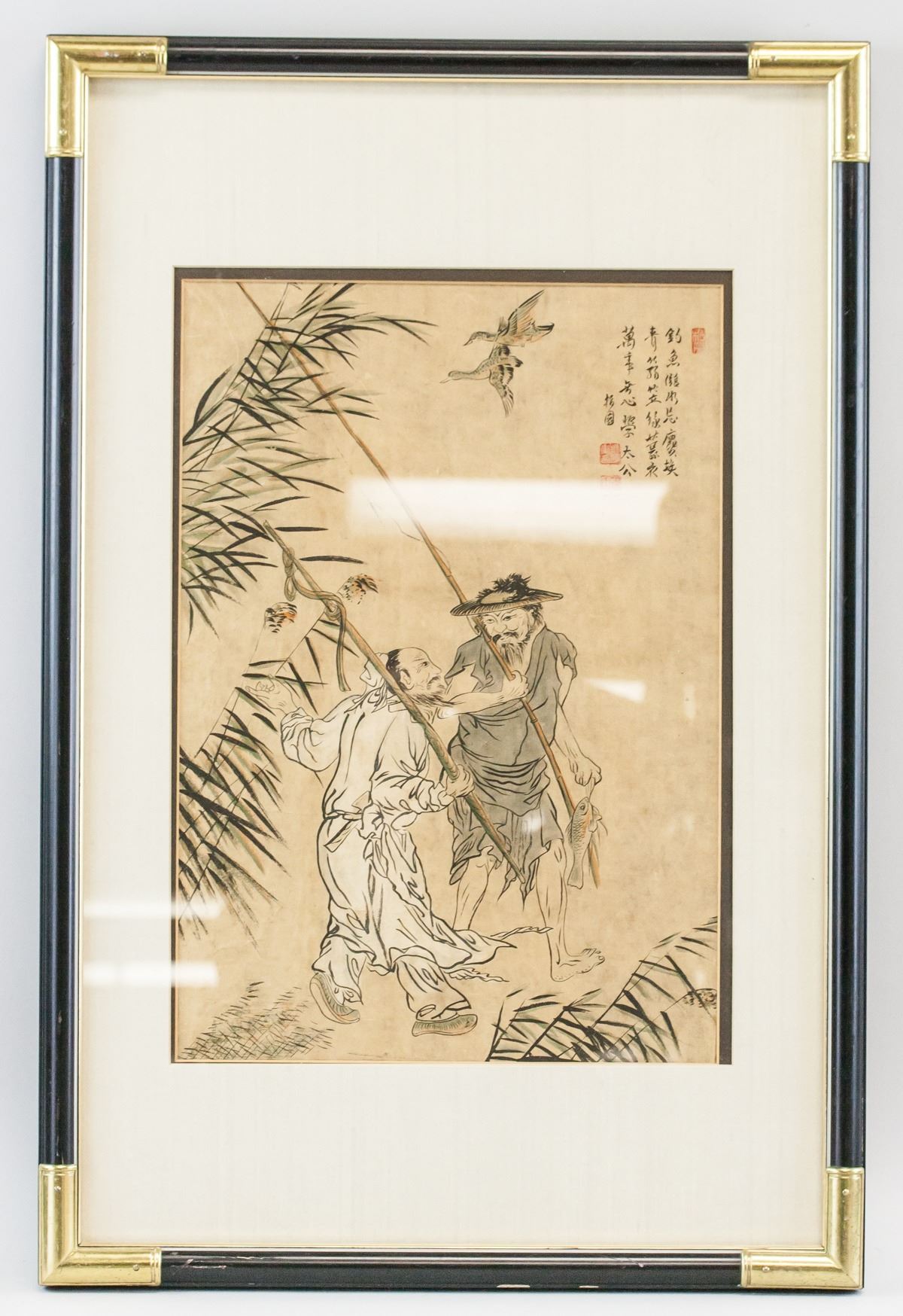 Watercolor on paper, framed. Featuring two figures carrying fishing rods over their shoulders. Inscribed with three seals. 41 x 29 cm (16 x 11 in), Frame: 64 x 43 cm (25 x 17 in).