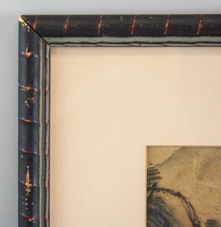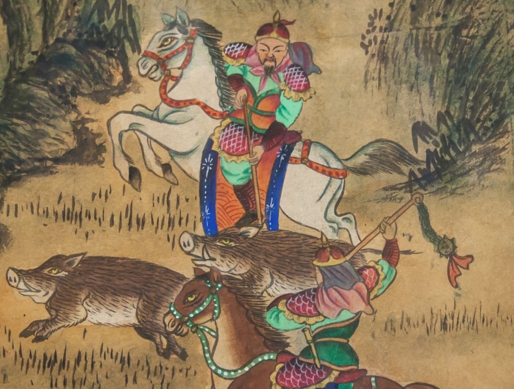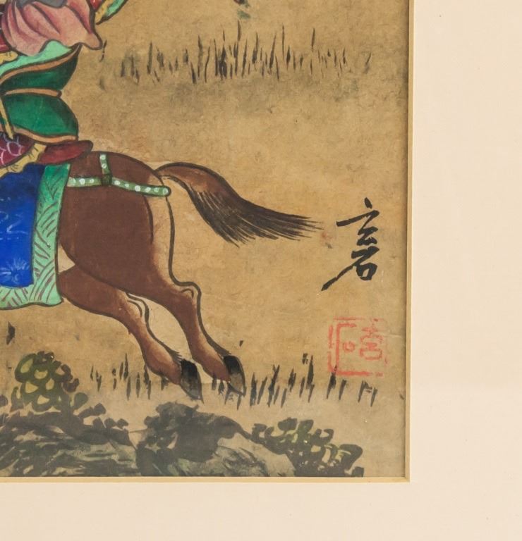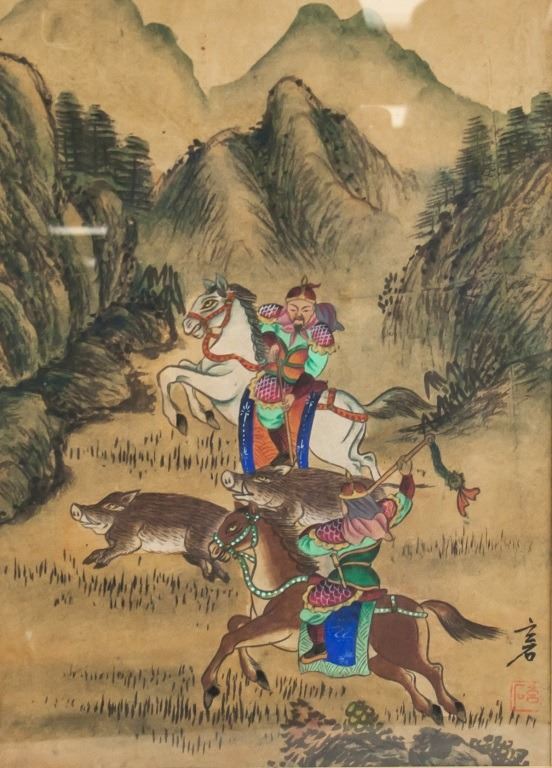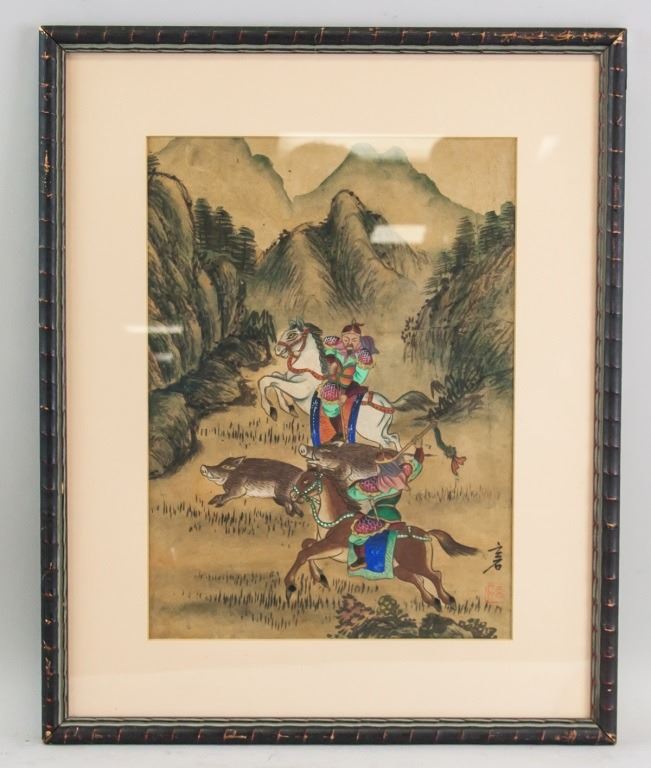 Korean watercolor on paper, framed. Featuring two riders hunting wild boars. Signed to the bottom right and inscribed with one seal. 37 x 27 cm, Frame: 54 x 44 cm.