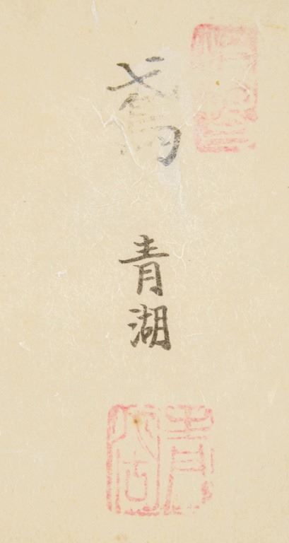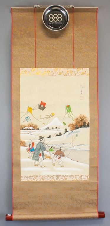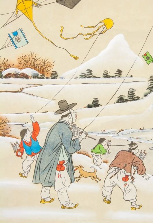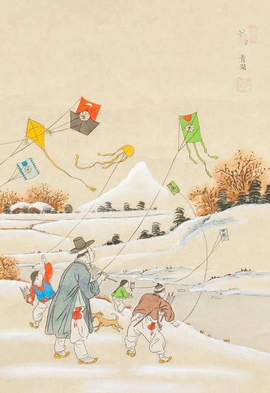 Korean watercolor on paper. Featuring a group of people flying kites in the snow. Inscribed with two seals. "Qing Hu" inscribed in Chinese characters to the top right. 45 x 28 cm .