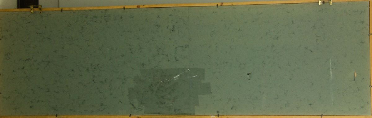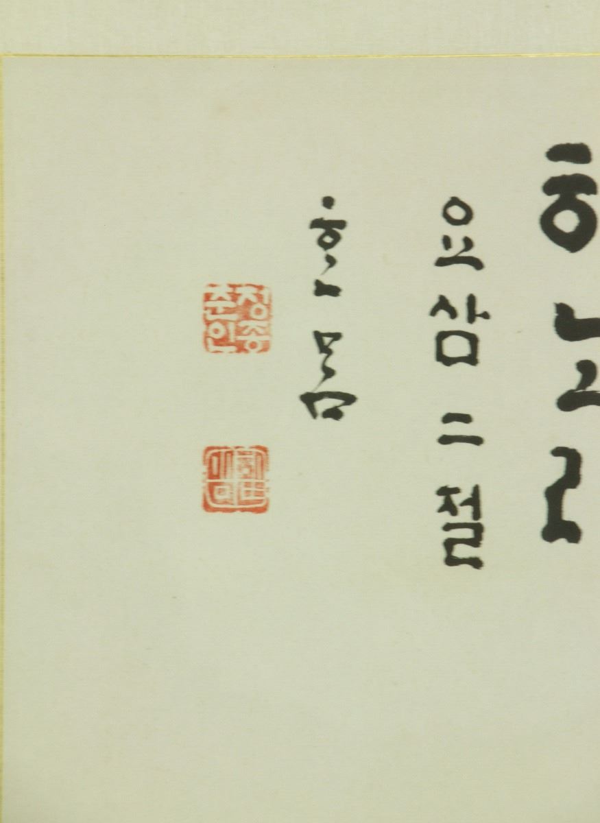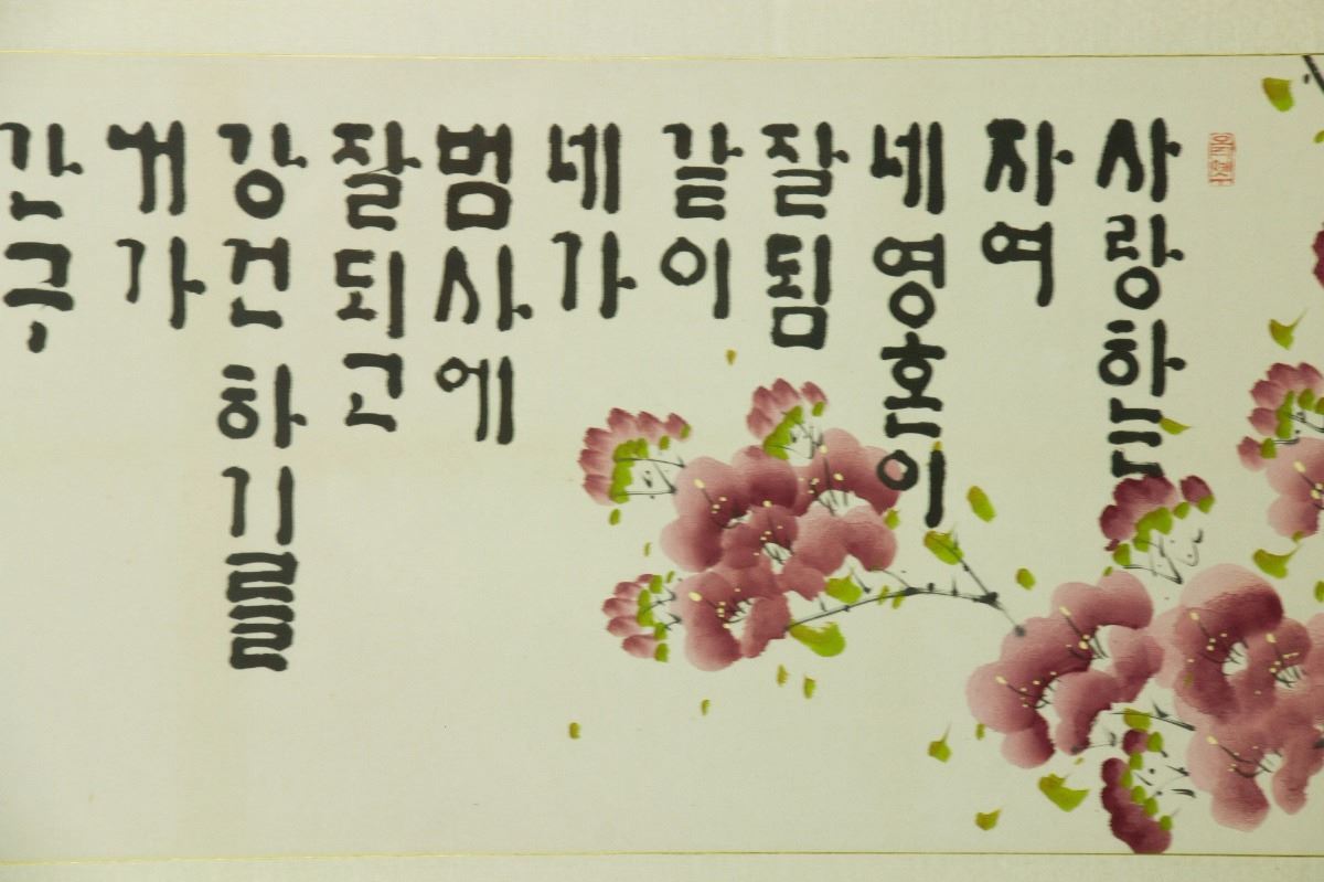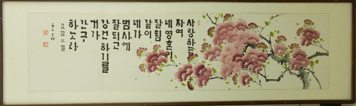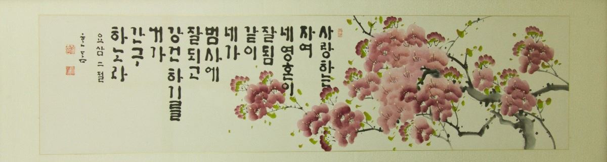 Plum blossom with Korean script calligraphy; ink and watercolour on paper; framed; signed and inscribed with two red seals; 46 cm × 156 cm