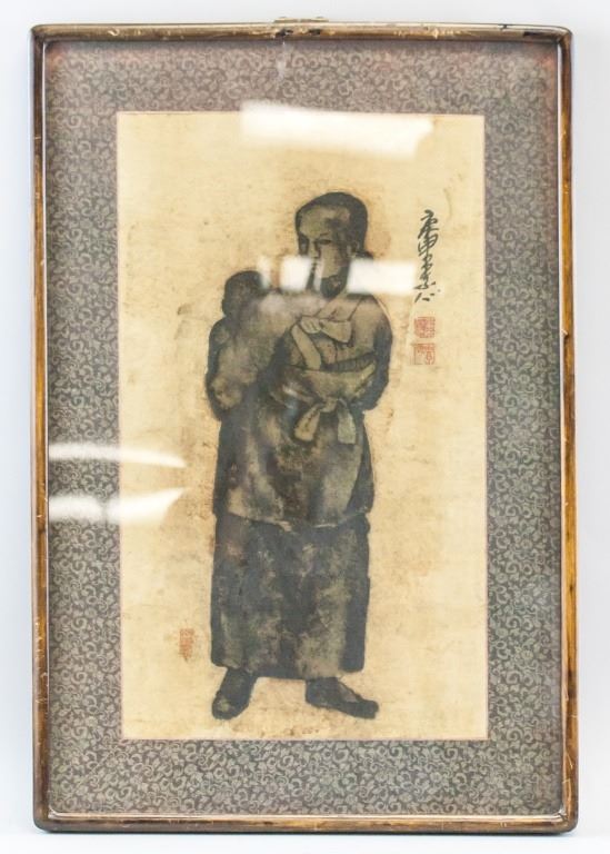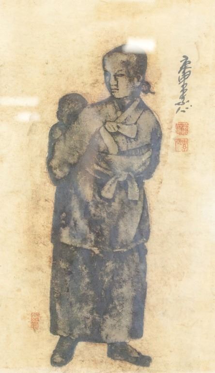 Korean woodblock on paper, framed. Featuring a woman carrying a child. Signed to the top right. Inscribed with three seals. 46 x 26 cm (18 x 10 inches). Frame size: 59 x 40 cm (23 x 15.5 inches).