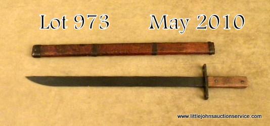 Korean “pole” bayonet and bamboo sheath for the Japanese Arisaka military rifle, approx. 19-1/2” overall with a 15-1/2” blade in overall very good condition with Jinsen Arsenal marking on hilt of blade; two rivet wood grips and two sided crossguard with openings to place on rifle (no iron pommel variation); sheath is in overall good + condition showing iron metal end pieces and two twine wrappings on the bamboo body that shows one crack that is approx. 5” long. Est.: $100-$200.