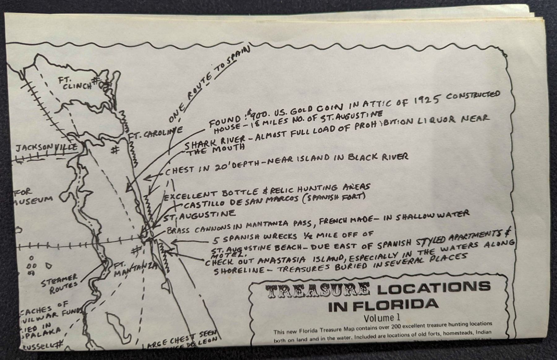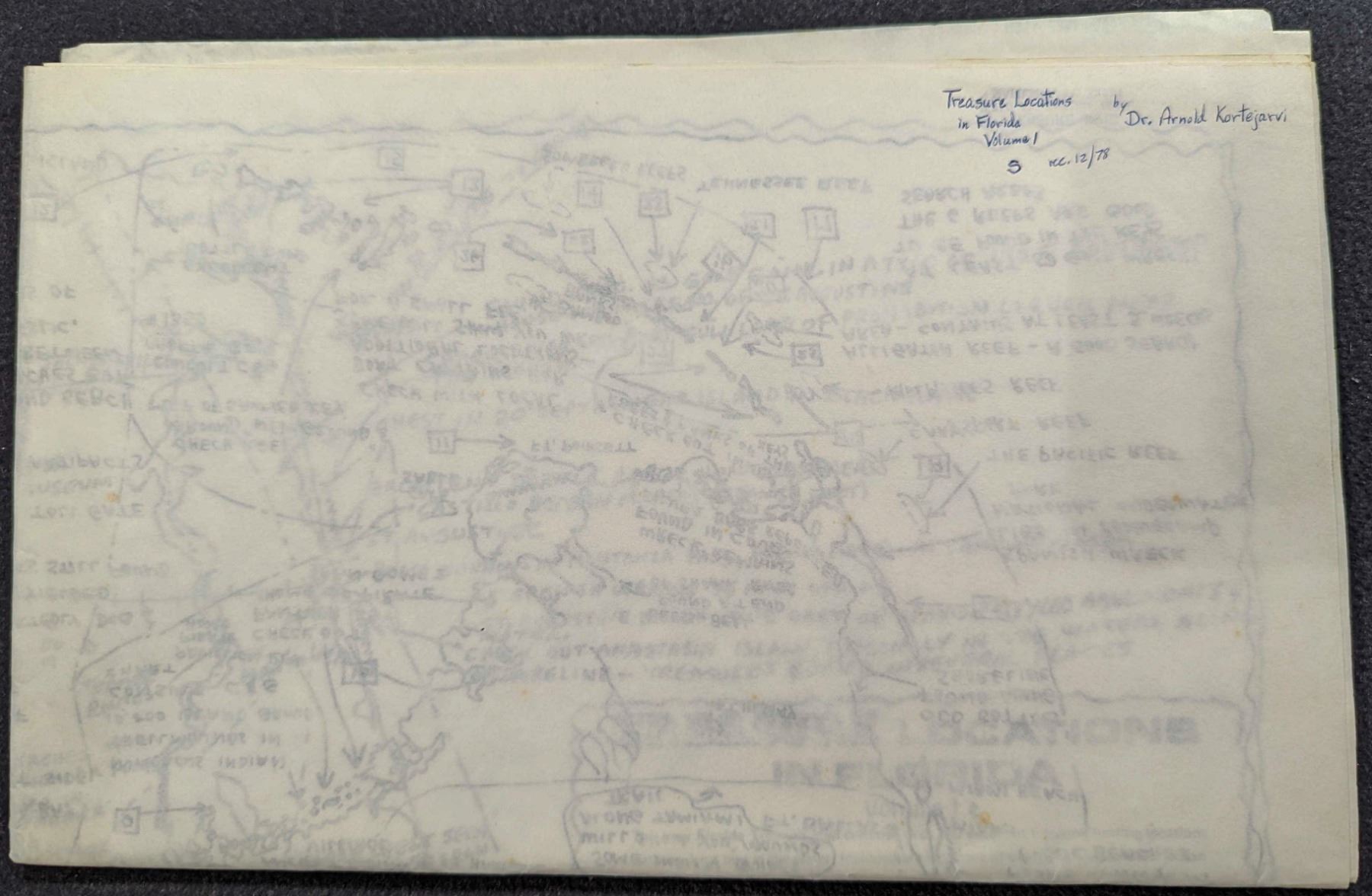Kortejarvi, Dr. Arnold. TREASURE LOCATIONS IN FLORIDA ? VOLUME 1. Search. 22x28. Pinellas. original printed paper. Fine. This map contains over 200 treasure hunting locations both on land and in the water. Included are locations of old forts, homesteads, sunken shipwrecks, and coin hunting areas. It also contains old trail locations, old shipping routes, and locations of past pirate villages. It regrettably lists 'Indian mounds' as possible treasure sites. These should be respected and not disturbed. Digging in them is illegal in the state of Florida. Lot weight: 0 lbs 3oz. Subject(s): Treasure Maps.