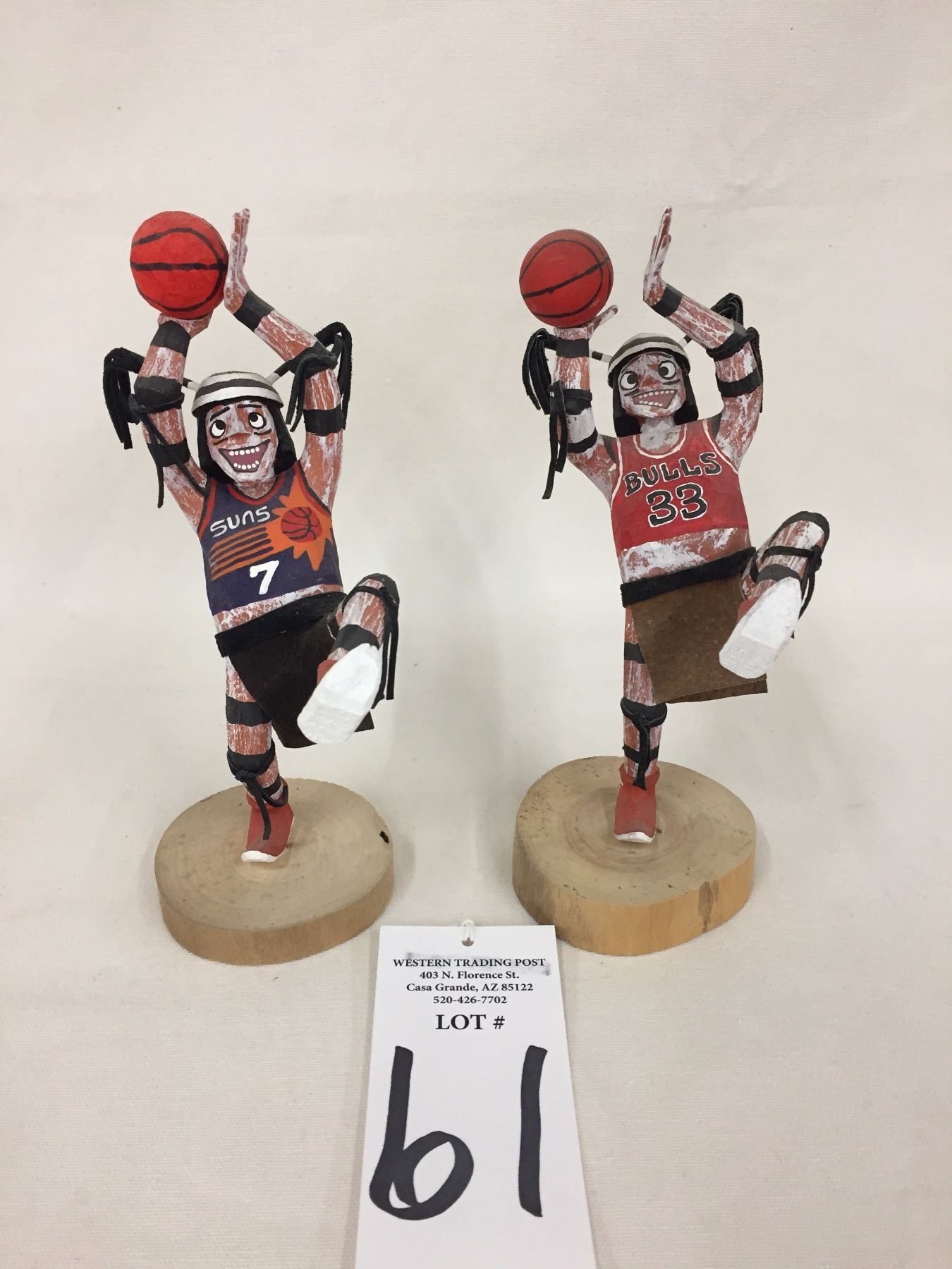 Description: Koshari basketball clown figures. Maker: Signed, Wood. Approx. Age: Fairly modern. Size: Measures 2 5/8" w 7 1/4" h. Condition: Good for their age, normal wear expected. Please look closely at the pictures - they are an important part of our description. Shipping: There will be a $10 handling / packaging fee for shipping this lot. The actual cost of postage will be added on top of that.