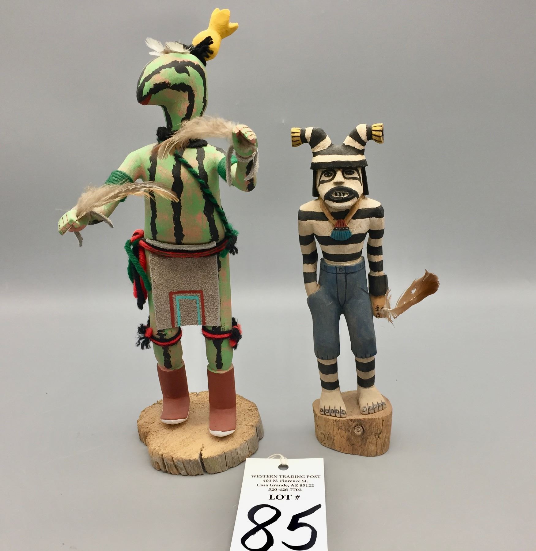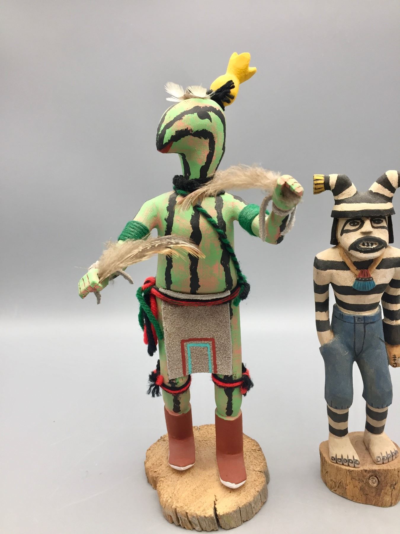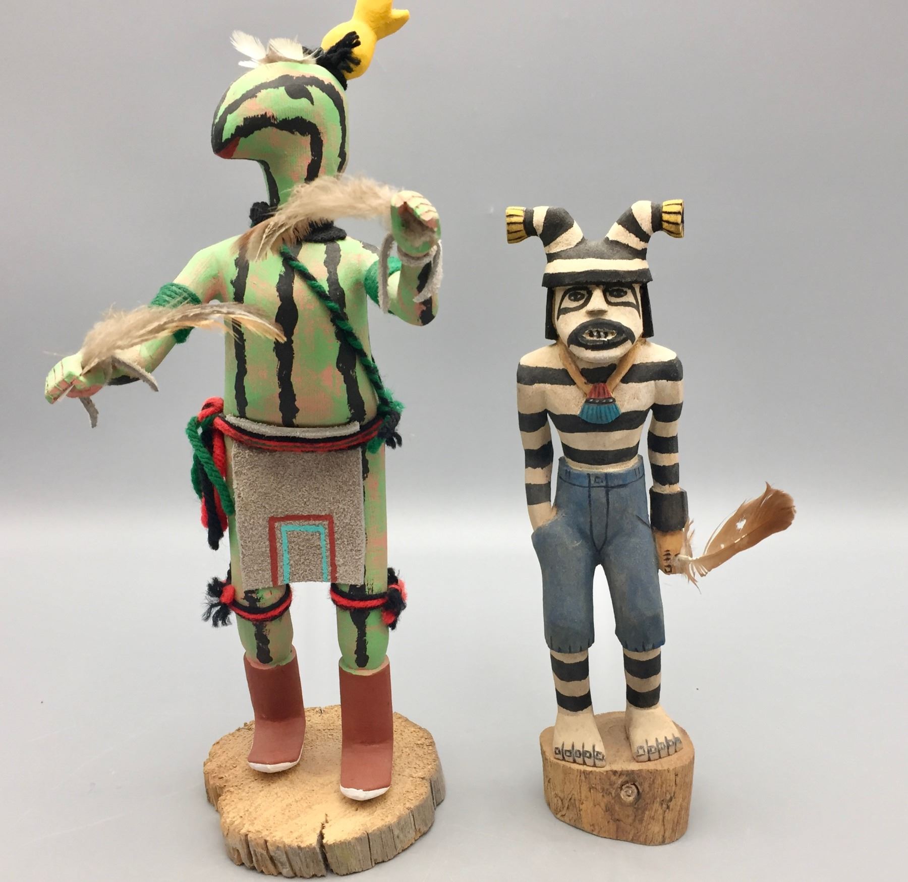 Description: Included for sale in this lot is a hand crafted Koshari Clown and Squash Kachina. Both are nicely detailed and hand carved. Maker: Signed by unknown artists (to us). Approx. Age: Fairly modern. Size: 4-1/2”w x 11” tall and 2-1/8”w x 8-1/2” tall. Condition: Good for its age, normal wear expected. Please look closely at the pictures - they are an important part of our description. Shipping: There will be a $10 handling / packaging fee for shipping this lot. The actual cost of postage will be added on top of that.
