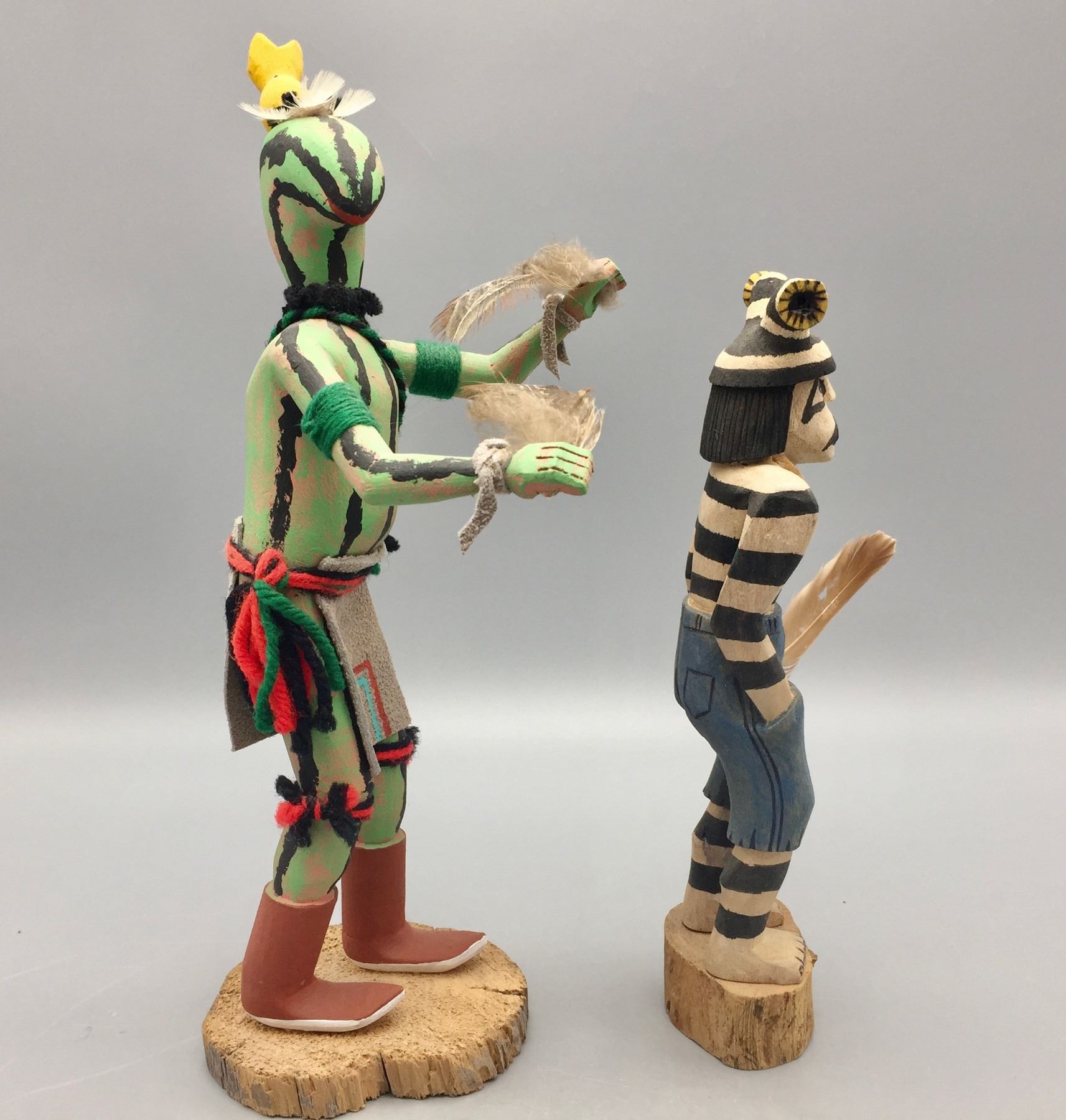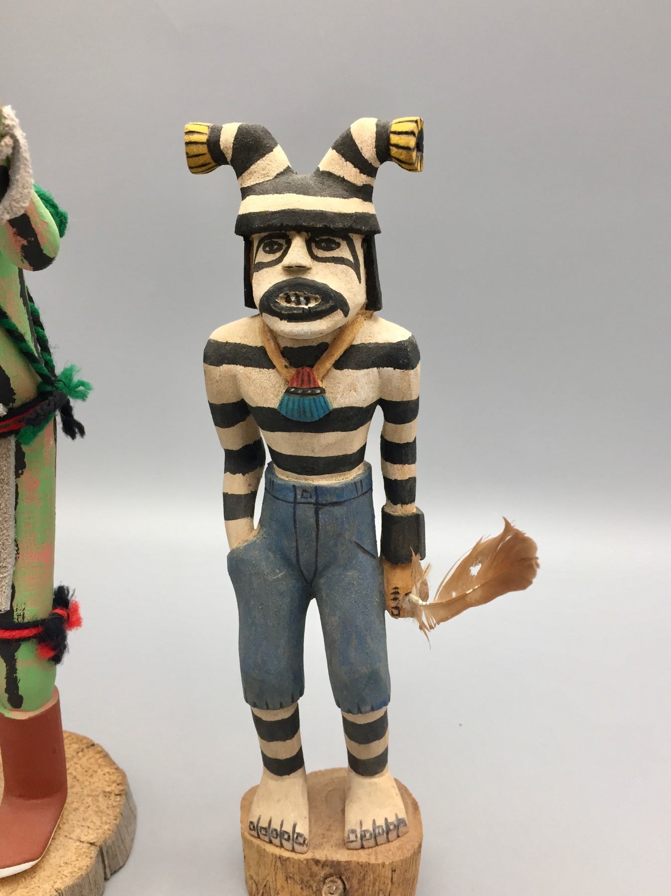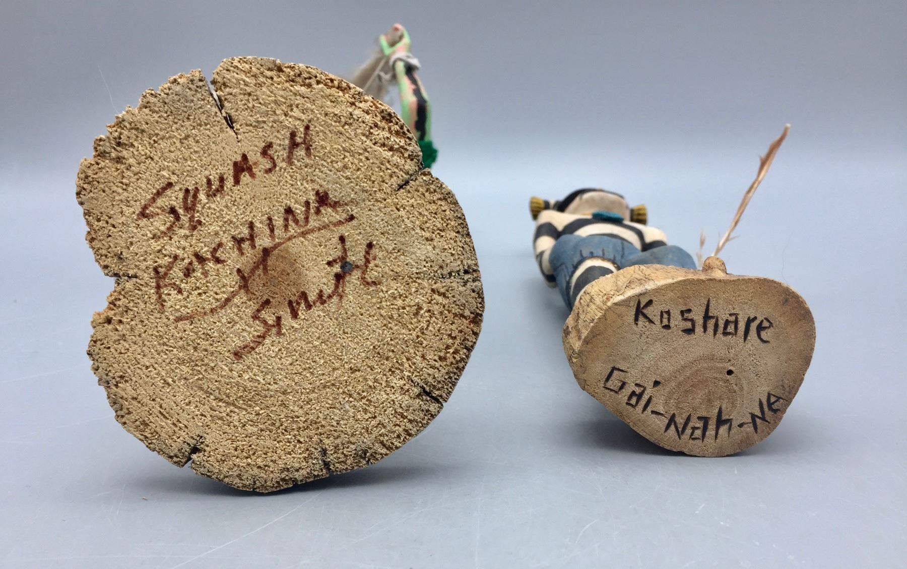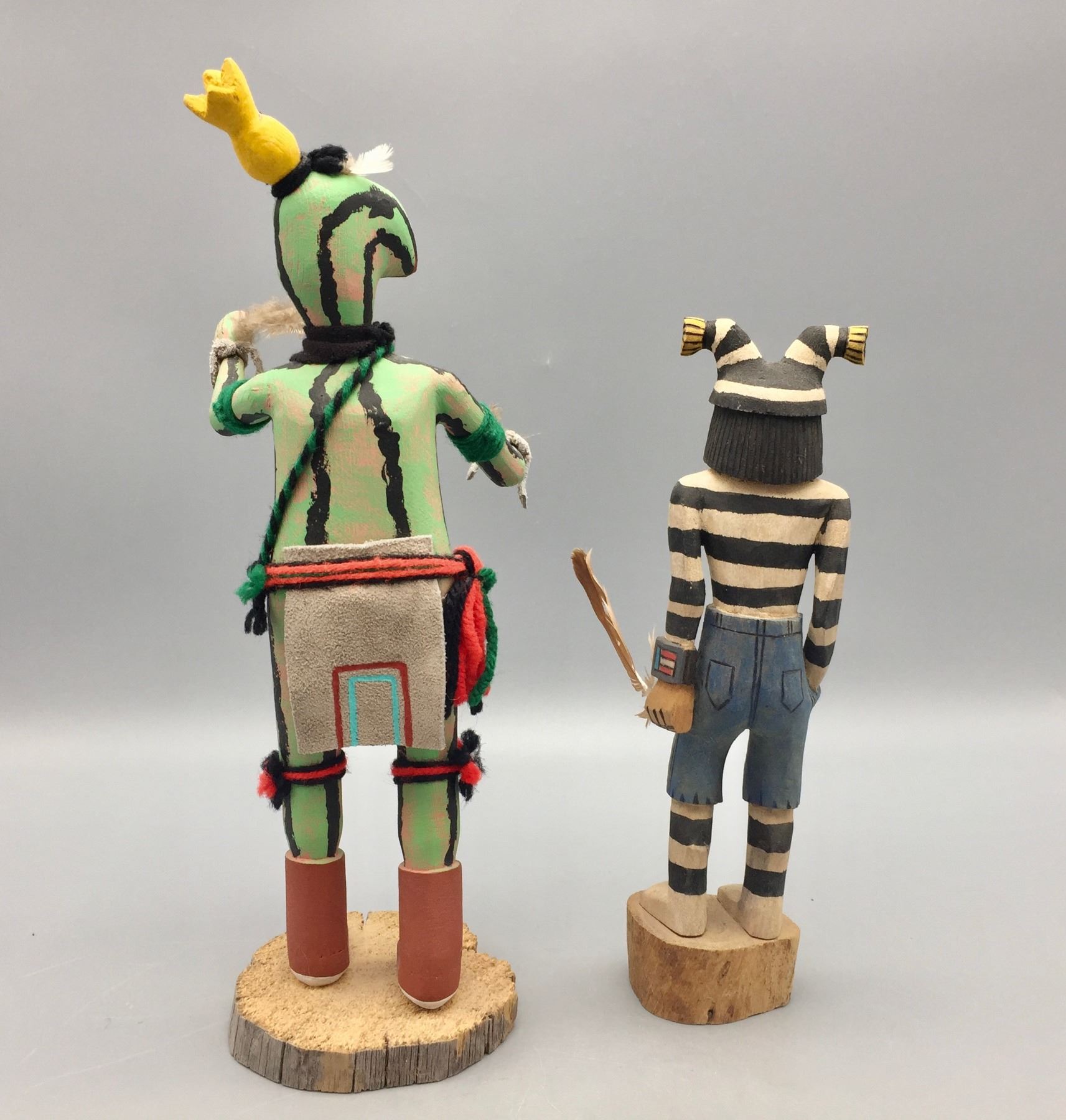 Description: Included for sale in this lot is a hand crafted Koshari Clown and Squash Kachina. Both are nicely detailed and hand carved. Maker: Signed by unknown artists (to us). Approx. Age: Fairly modern. Size: 4-1/2”w x 11” tall and 2-1/8”w x 8-1/2” tall. Condition: Good for its age, normal wear expected. Please look closely at the pictures - they are an important part of our description. Shipping: There will be a $10 handling / packaging fee for shipping this lot. The actual cost of postage will be added on top of that.