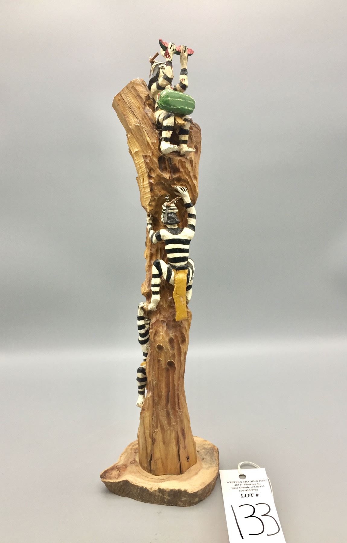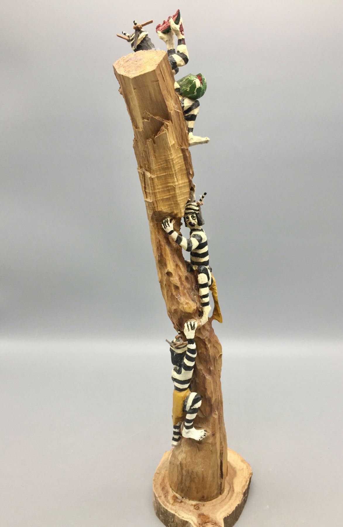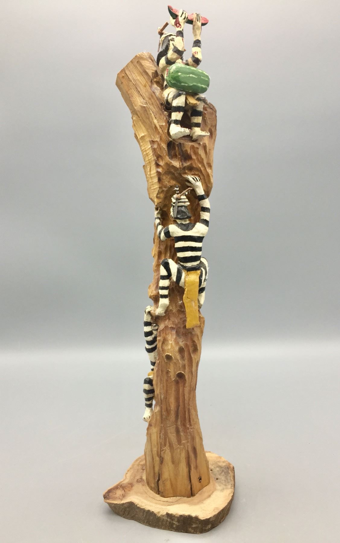 Description: For sale in this lot we have a group of Koshari clowns climbing a tree and eating a watermelon. This is handmade piece. Maker: Signed, E. Whitehorse. Approx. Age: Vintage. Size: 18-1/8 inches tall x 5 inches wide. Condition: Good for its age, normal wear expected. Please look closely at the pictures - they are an important part of our description. Shipping: There will be a $8 handling, packaging fee for shipping this lot. The actual cost of postage will be added on top of that.