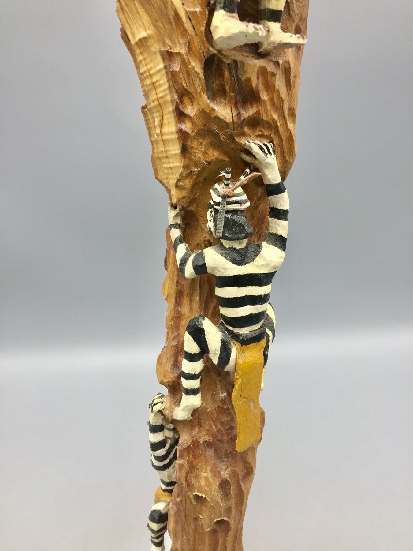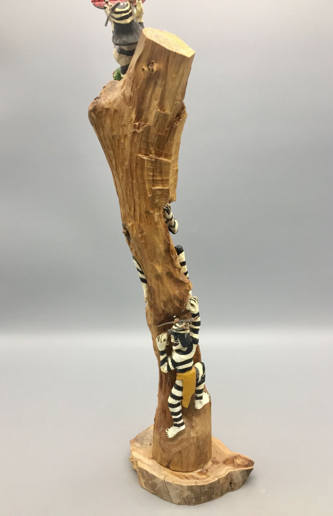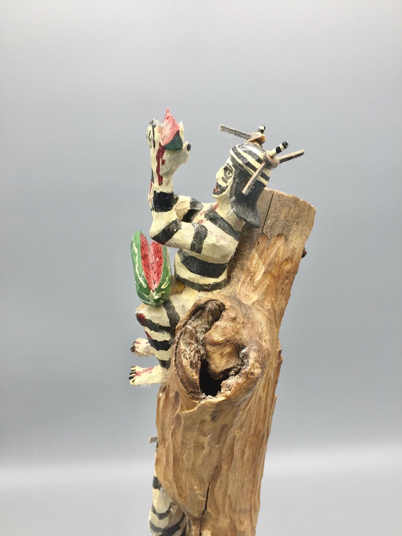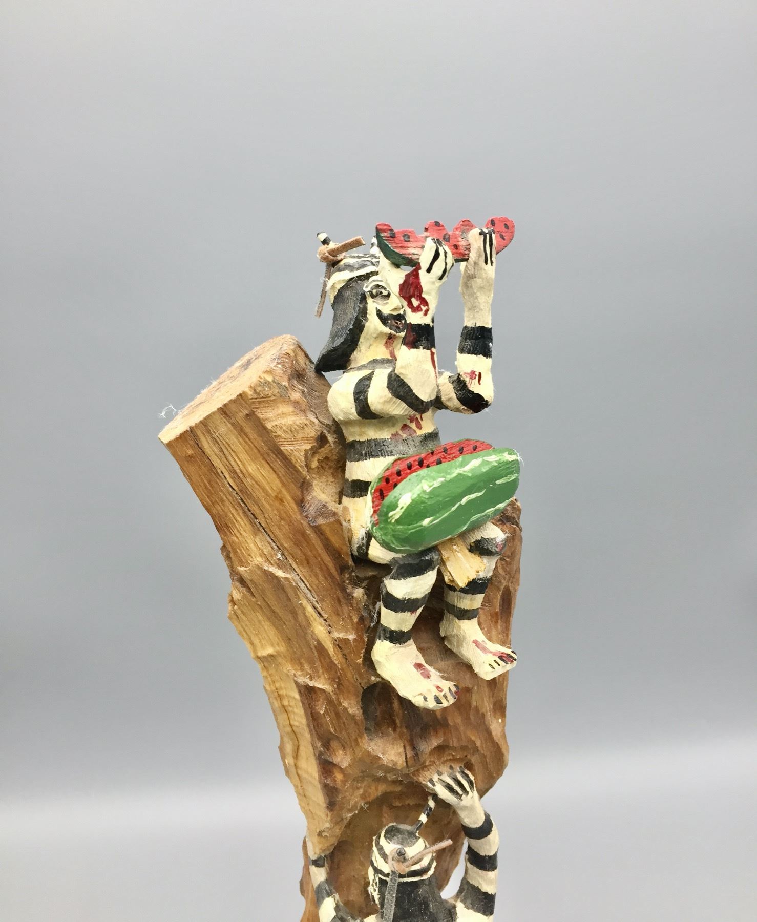 Description: For sale in this lot we have a group of Koshari clowns climbing a tree and eating a watermelon. This is handmade piece. Maker: Signed, E. Whitehorse. Approx. Age: Vintage. Size: 18-1/8 inches tall x 5 inches wide. Condition: Good for its age, normal wear expected. Please look closely at the pictures - they are an important part of our description. Shipping: There will be a $8 handling, packaging fee for shipping this lot. The actual cost of postage will be added on top of that.