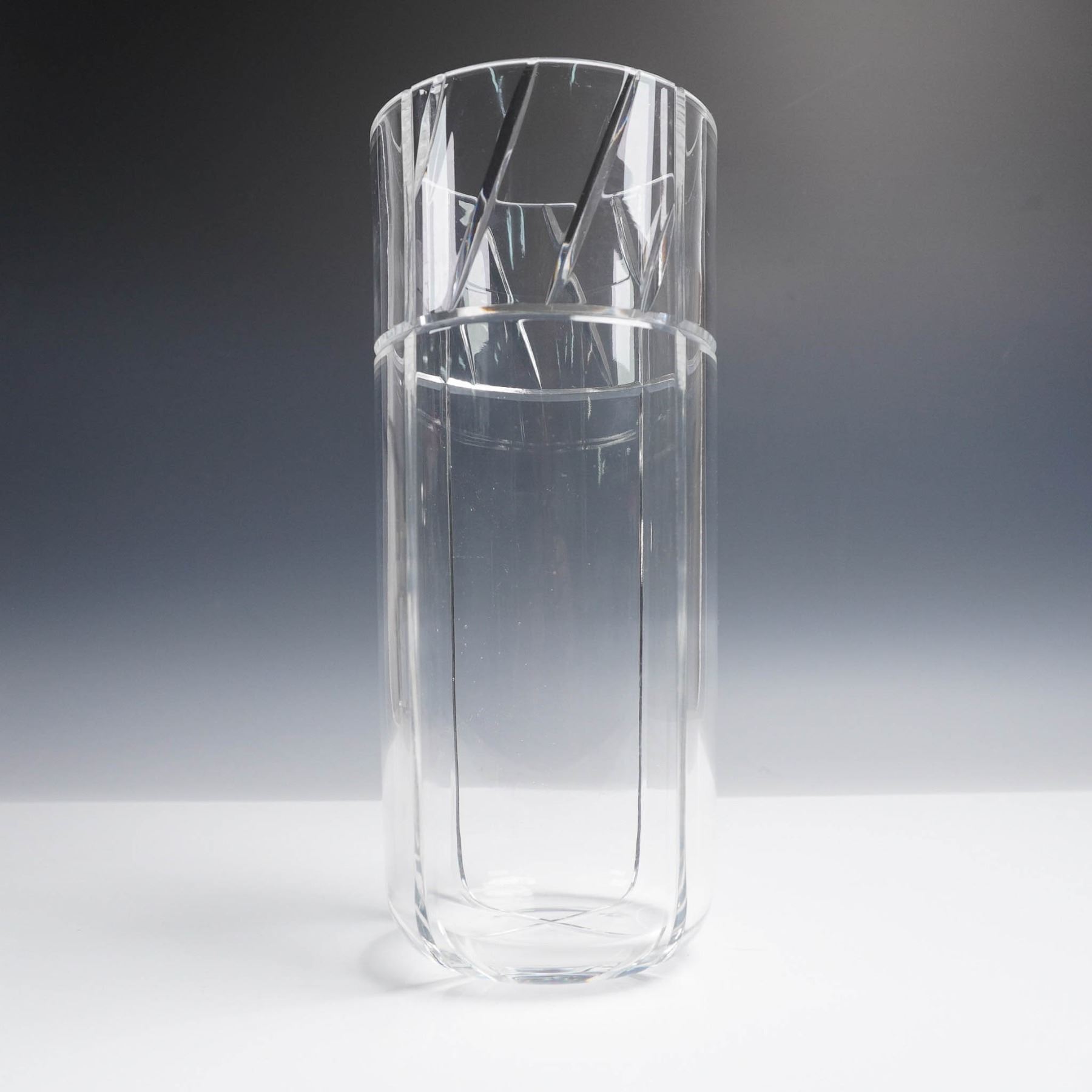 Striking Scandinavian modern cut crystal vase by Kosta Boda, designed by Danish artist Lin Utzon. The tall cylindrical form is adorned with elegant angular cuts in the upper third, creating dynamic geometric refractions through the clear glass body. Signed along the base Kosta Boda 48802 Lin Utzon, this vase is a limited edition example from one of Sweden's premier glassworks, celebrated for bold, contemporary design and craftsmanship. Housed in substantial clear crystal with faceted edges and fine clarity, the vase reflects Utzon's sculptural approach to functional forms.