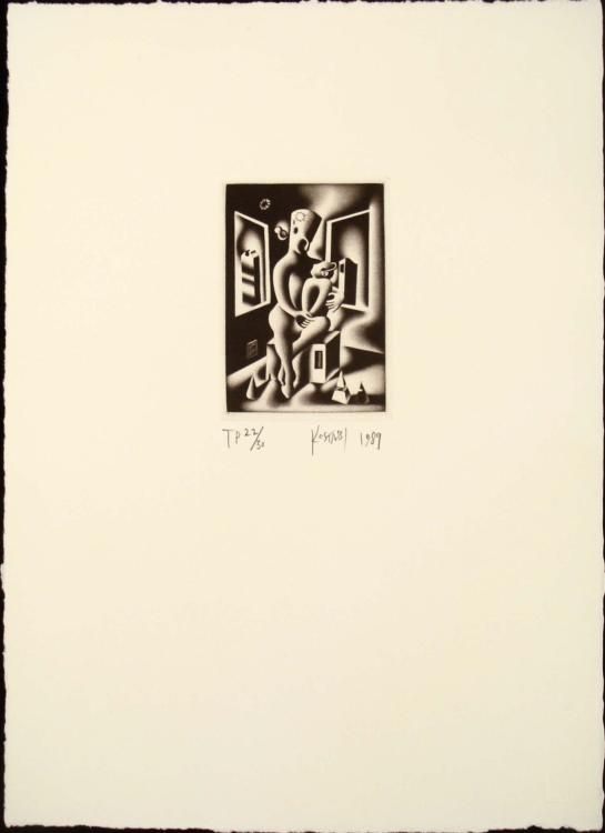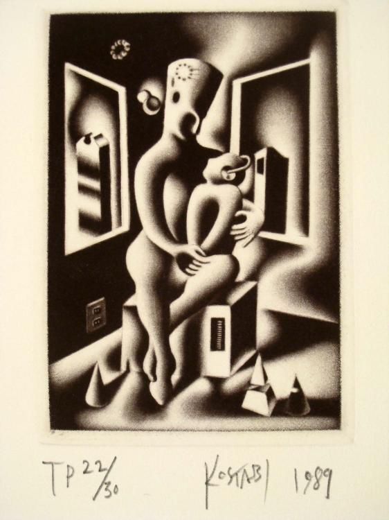 It's okay baby, mommy's got you, mommy's got you... * Artist: Kostabi Title: Oepdipus of Mother Knows Best Medium: Mezzotint on paper Edition: TP 22/30 Signature: in pencil, lower right Date: 1989 Size of Image: 3 1/4" x 4 5/8" Size of Paper: 11 1/4" x 15 1/2" Condition: Very Good * *