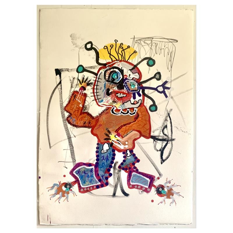 "Squabling Amongst Myself" is a mixed media original painting on paper by Paul Kostabi. Hand signed, this piece comes with a letter of authenticity. Measures approximately 41.5" x 29.5".