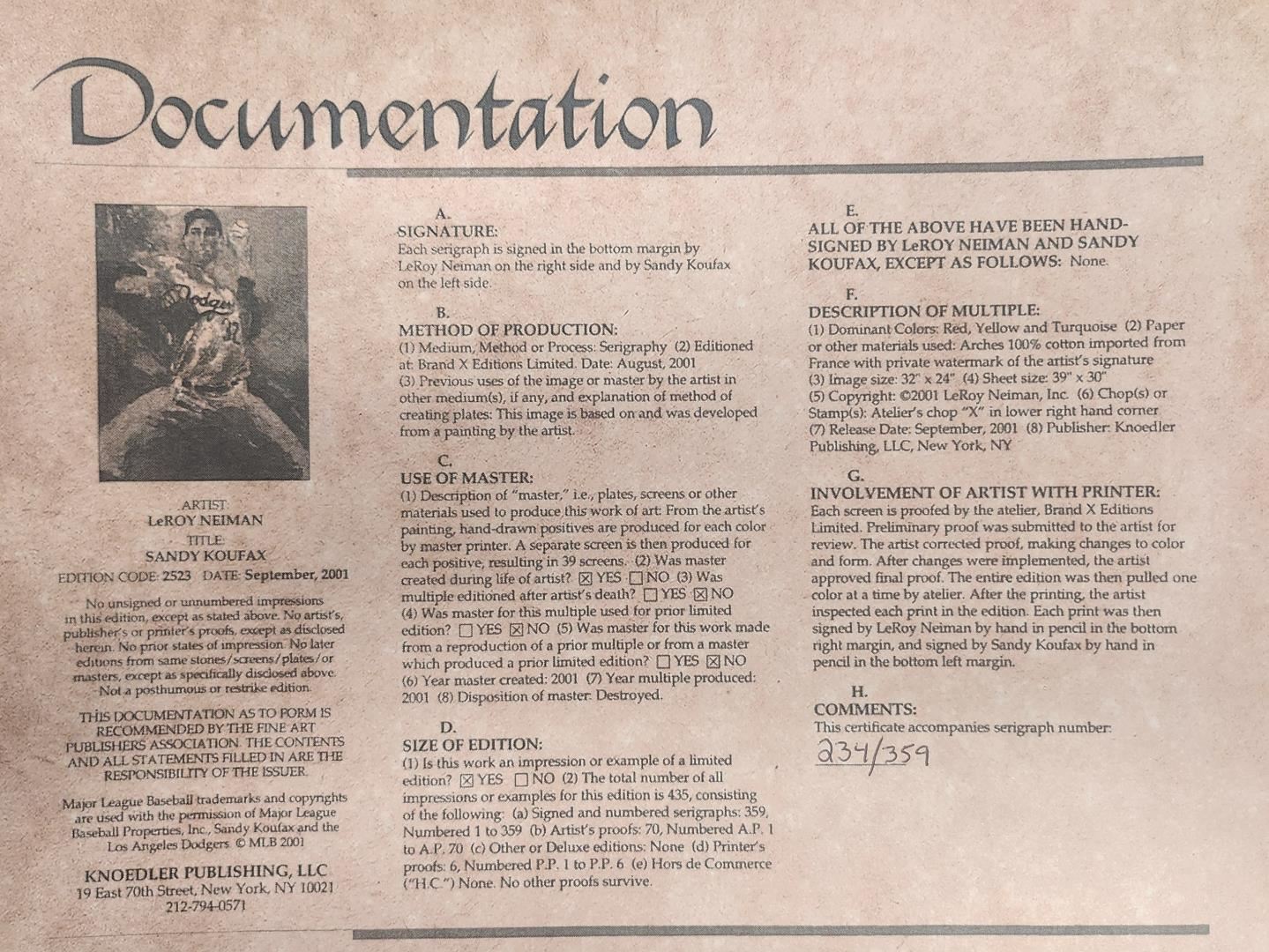 "Koufax" by LeRoy Neiman (1921-2012) hand signed Limited Edition Serigraph #234 of 359 signed by the artist and the subject of the picture, Sandy Koufax!!! - Framed Size = 48" x 38"