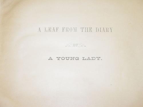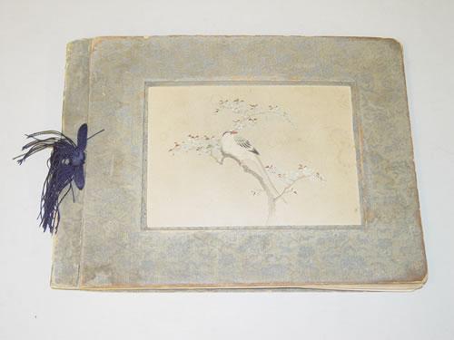 Kozaburo, Tamamura. A Leaf From the Diary of a Young Lady. 12mo - over 6¾" - 7¾" tall. Hard Cover. Good Condition. Circa 1904. THIS IS NOT AN EX-LIBRARY BOOK. 24 tissue guarded, hand colored, collotype photographs with English text, depicting a Japanese Lady in Kimono receiving an invitation, dis-robing, maid assisting her in dressing, visiting her friend, Tea Ceremony ( and more) then returning home. Last leaf detached. Bound in silk brocade, framing a hand-painted bird in a flowering tree, bundled thread binding, oblong format. Covers soiled with gutters starting..