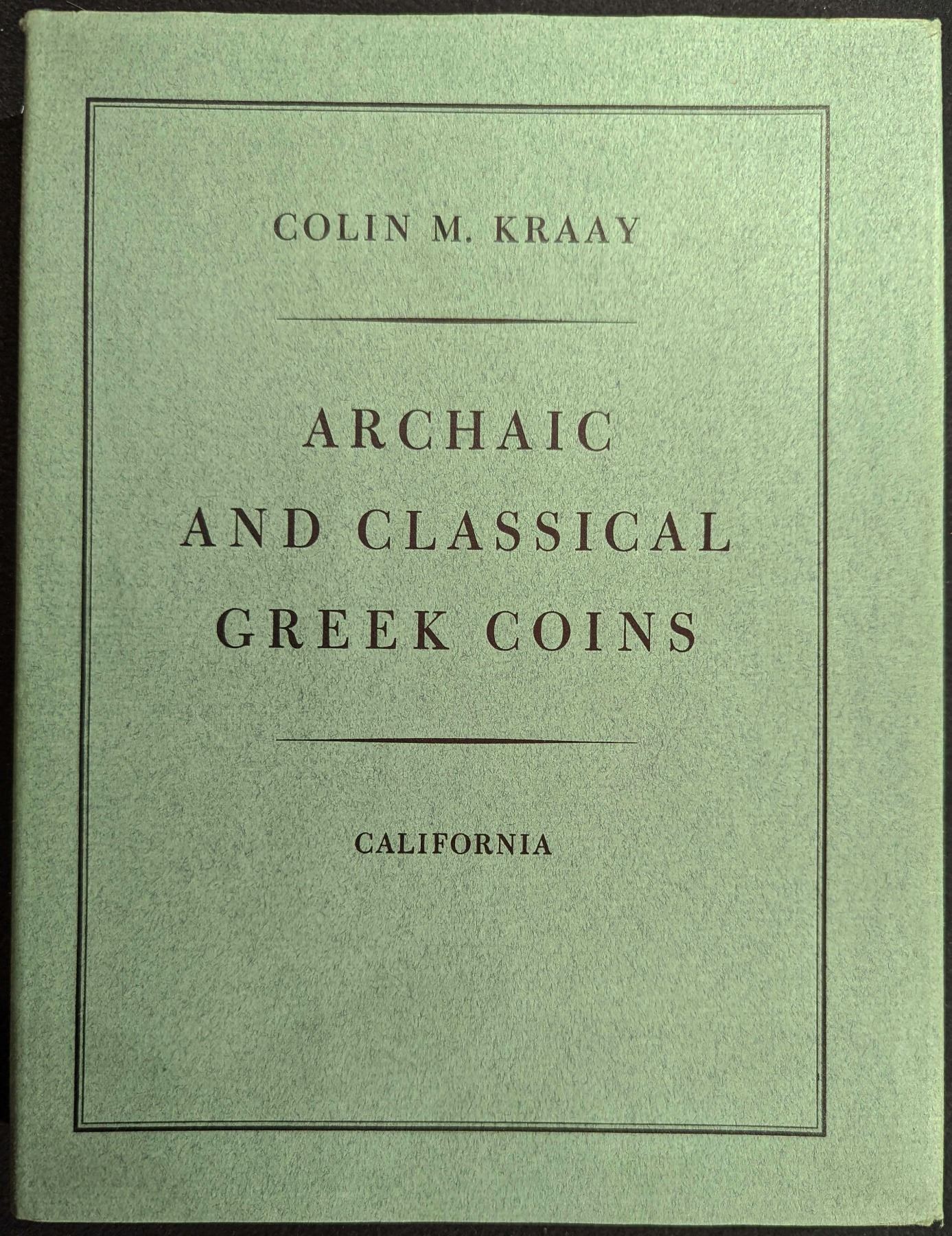 Kraay, Colinn M. ARCHAIC AND CLASSICAL GREEK COINS. University of California Press. 1976. 8vo. 390 pages. Berkeley. original green cloth, black title plate, gilt, dust jacket. maps. 64 fine plates. Fine. Colin Kraay, Keeper of the Herberden Coin Room at Oxford, has provided a much needed, up-to-date handbook of Greek Coinage. In this descriptive, critical and historical catalogue, Kraay acknowledges a debt to his major predecessors, Babelon. Head, Gardner and Seltman. His taxonomy is practical and sensible. Following the modern trend of mint and die studies, he divides his material geographically according to the emergence of the earliest mints in Asia Minor, then proceeding to subsequent developments on the Mainland and the Aegean Islands, Magna Graecia, and finally the peripheral areas of the Greek East. This arrangement succeeds in organizing his material geographically as well as chronologically while retaining the essential integrity of separate mints. For, as Kraay proposes in his preface, the history of Greek Coinage cannot be dealt with sufficiently by a simply chronological approach, as is the case with Roman and Byzantine coinage, since the Hellenic material. This is the definitive 'textbook' for the student and collector of Greek coins. Lot weight: 2 lbs 14oz. Subject(s): Ancient Coinage.
