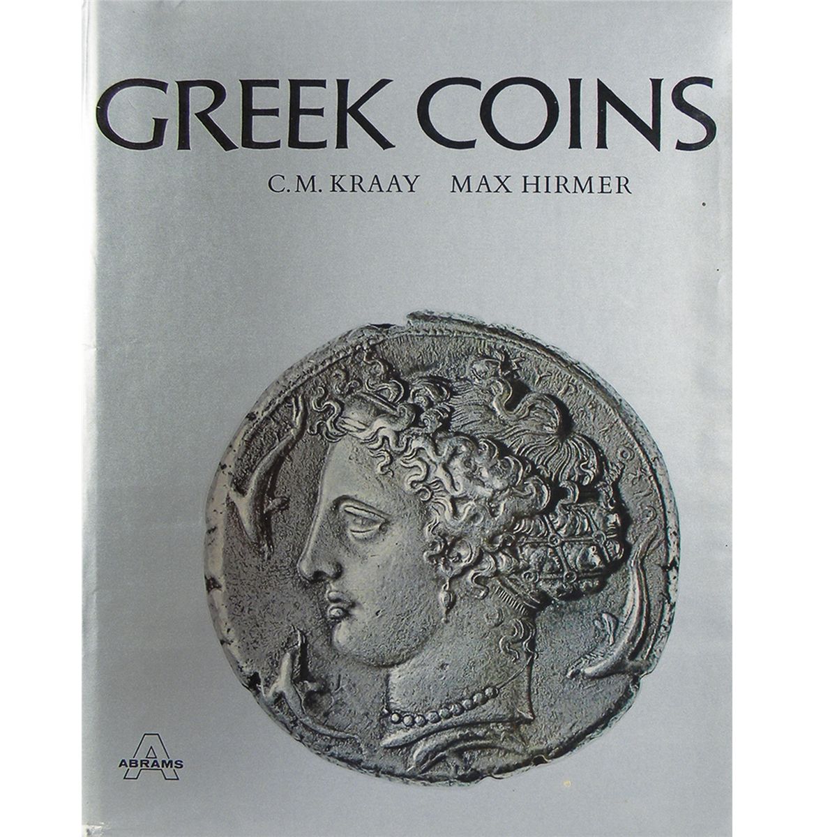 Kraay, Colin M., and Max Hirmer. GREEK COINS. New York: Harry N. Abrams, (1966). 4to, original tan linen, gilt; jacket. 396 pages; 4 maps; 20 most attractive plates of tipped-in enlarged illustrations of coins in full color; 1329 additional fine coin illustrations. Light general wear; near fine. An important and popular book. Clain-Stefanelli 1849*. Grierson 53. Kroh 7 (5 stars): "the ultimate 'coffee-table' book; certainly the finest work on Greek coins ever printed. It is massive in size, and contains many fantastic enlargements of the best Greek coins you are ever likely to see. The text (by Colin Kraay) is very well written, and the photography (by Max Hirmer) is truly incredible, even by today's standards. Long out of print, this is arguably the world's most sought after numismatic book."