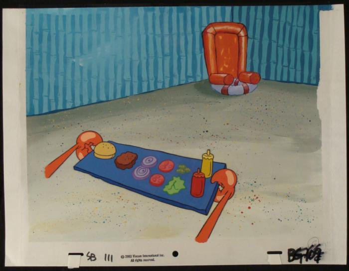 This original hand-painted background and animation cel are from the Nickelodeon TV show SpongeBob Squarepants. The story takes place under the deep blue sea in Bikini Bottom, where SpongeBob resides. SpongeBob, who is a yellow, porous sponge, is your typical happy-go-lucky character, as he is always cheerful and enjoys making people laugh. Patrick Star, SpongeBob's neighbor who is a starfish, is your average children's show idiot, as he boasts knowing nothing and is often getting himself into ridiculous situations. Between the homes of these two lies the home of the miserable Squidward, a squid, who is known for being grouchy and playing tricks on SpongeBob and Patrick. Both SpongeBob and Squidward work at the Krusty Krab, a fast food business run by the greedy money-loving Mr. Krabs, a crab, the arch rival of the evil, possibly misunderstood, Plankton. Another neighbor, Sandy Cheeks, an athletic squirrel who normally wears an astronaut's space suit, was introduced in "Tea at the Treedome." She spends most of her time inventing and experimenting. It seems Mr. Krabs forgot the Krabby Patty secret formula.Original Production Background and Animated Cel Overall Size of Background: 10 1/2" x 13 3/4" Overall Size of the Cel: 10 1/2" x 12 1/2" Very good condition; it has been stored This is an original hand-painted cel set-up used in the production of an episode of "SpongeBob SquarePants." Each one-of-a-kind set-up represents a slight change in position of the characters. When individually photographed and projected in rapid succession, the images appear to move.