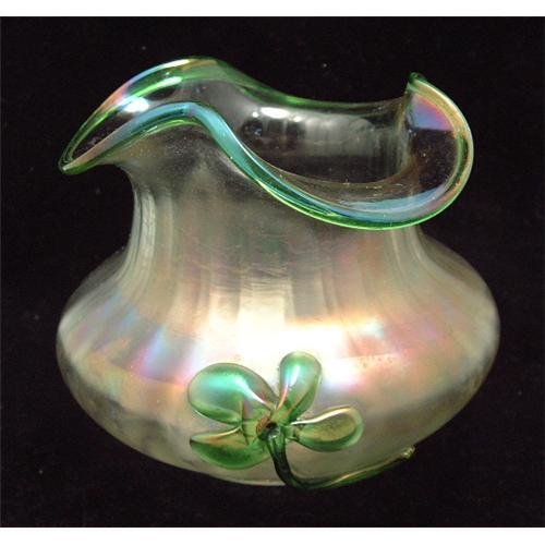 Kralik Vase that is all hand blown. The crystal glass has an irridescence to it with green applique applied to both sides. each one is a flower and attached stem. The smooth polished rim is also applied with the green glass. Polish pontil on base. Two photos show this vase with a black background and two photos show it with a white background. 4 1/2" tall and 4 3/4" across.