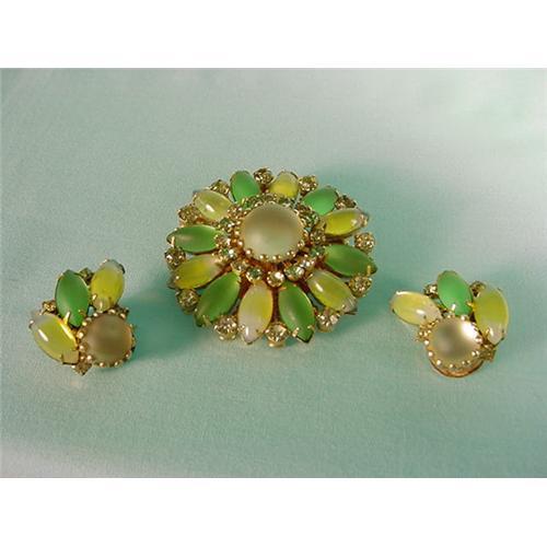 2 inch Diameter Brooch ** 1 inch Clip On Earrings ** Brooch is Not Signed but the Earrings Are ** But Truly a Set ** Beautiful Lime Green and Yellow Stones Prong Set on Gold Colored Metal ** Circa 50s ** Excellent Condition