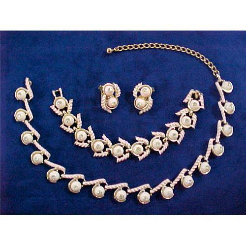 This beautiful necklace, bracelet, and clip-on earrings set is marked "Kramer" with the copyright symbol which dates them after 1955. Kramer produced jewelry using the best quality rhinestones available until they went out of business in the late 1970's. This set has pale pink stones all set with a small rhinestone in the center and encircled in silvertone metal with pink and silver rope-like trim. The clasps and earring clips and necklace extension are goldtone. Missing small hook for the necklace, otherwise in excellent condition.