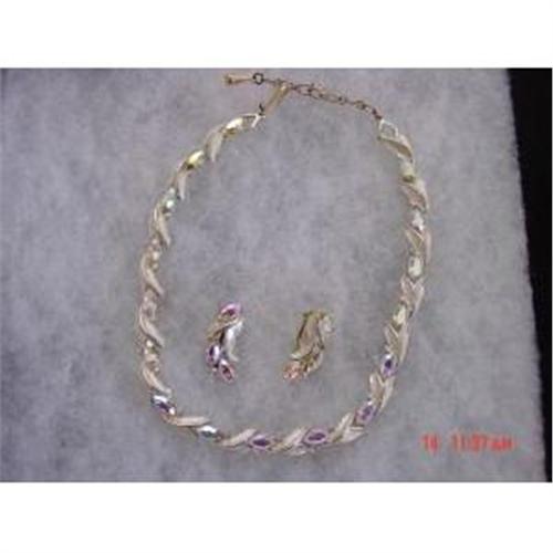 Signed Kramer Aurora Borealis Rhinestone Enamel Necklace And clipped earrings, Good condition
