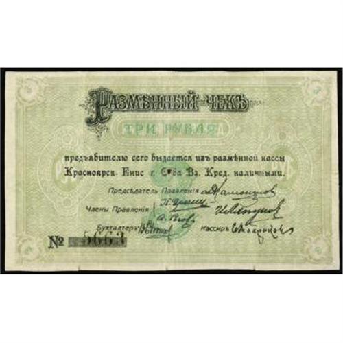<style type="text/css"> body, td, th { font-family: Arial, Helvetica, sans-serif; font-size: 12px; color: #482424; margin: 0px; padding: 0px; } #header { background-image: url(http://www.bowersandmerena.com/ebay/images/template_v3_01.gif); clear: both; background-color: #590303; border-top-width: 2px; border-top-style: solid; border-top-color: #B38C4F; } #header #header_wrapper { height: 75px; clear: both; width: 800px; margin-right: auto; margin-left: auto; background-image: url(http://www.bowersandmerena.com/ebay/images/template_v3_03.gif); background-repeat: no-repeat; background-position: right; color: #F3EDCC; } #header #header_wrapper #header_logo { float: left; height: 75px; width: 444px; background-image: url(http://www.bowersandmerena.com/ebay/images/template_v3_02.gif); background-repeat: no-repeat; font-size: 10px; text-transform: capitalize; color: #B38C4F; } #header #header_wrapper #header_right { float: left; height: 75px; width: 356px; text-align: right; } #header #header_wrapper #header_right #headerLoginBtn { margin-bottom: 30px; } #header #header_wrapper #header_right input#txtSearch { color: #B49056; border: 1px solid #B49056; width: 175px; padding-top: 3px; padding-right: 3px; padding-bottom: 4px; padding-left: 3px; } #nav { height: 37px; background-image: url(http://www.bowersandmerena.com/ebay/images/template_v3_05.gif); clear: both; } #nav #nav_wrapper { height: 35px; width: 800px; margin-right: auto; margin-left: auto; border-left-width: 1px; border-left-style: solid; border-left-color: #B38C4F; } #nav #nav_wrapper a { padding-right: 15px; padding-left: 15px; border-right-width: 1px; border-right-style: solid; border-right-color: #B38C4F; height: 25px; padding-top: 10px; display: block; float: left; text-decoration: none; font-weight: bold; color: #5D0303; } #nav #nav_wrapper a:hover { color: #B38C4F; } #nav #nav_wrapper #search { float: right; padding-top: 7px; } #nav #nav_wrapper #search #txtSearch { font-family: Arial, Helvetica, sans-serif; font-size: 10px; text-transform: uppercase; color: #D2AE75; border: 1px solid #B38C4F; padding: 3px; } #content_bgd { background-image: url(http://www.bowersandmerena.com/ebay/images/template_v3_09.gif); background-repeat: repeat-y; background-position: center; padding-top: 15px; padding-bottom: 15px; background-color: #FBFBDB; } #content_wrapper { clear: both; height: auto; width: 800px; margin-right: auto; margin-left: auto; } .LotDetailWhite { line-height:normal; font-size:13px; font-family: arial,helvetica,sans-serif; color: White; font-weight: bold; } .LotDetailInformation { line-height:normal; font-size: 13px; font-family: arial,helvetica,sans-serif; } .LotDetailMessage { line-height:normal; font-size: 13px; font-family: arial,helvetica,sans-serif; color: red; } } tr.HeaderAuctionTitle td { color: #000000; font-weight: bold; padding: 2px; background-image: url(http://www.bowersandmerena.com/ebay/images/template_v3_05.gif); background-repeat: repeat-x; border-bottom-width: 1px; border-bottom-style: solid; border-bottom-color: #B38C4F; } table.AuctionSummary a, table.AuctionSummary a:link, table.AuctionSummary a:visited { color: #0000FF; text-decoration: none; } } td.tableHeaderLeft { border-left-width: 1px; border-left-style: solid; border-left-color: #B38C4F; } td.tableHeaderRight { border-right-width: 1px; border-right-style: solid; border-right-color: #B38C4F; } td.tableCellMiddle { border-left-width: 1px; border-left-style: solid; border-left-color: #B38C4F; border-right-width: 1px; border-right-style: solid; border-right-color: #B38C4F; padding: 5px; } tr.footer td { border-top-width: 1px; border-top-style: solid; border-top-color: #B38C4F; } </style> </head> <body> <div id="header"> <div id="header_wrapper"> <div id="header_logo"> </div> <div id="header_right"> </div> </div> </div> <div id="nav"> <div id="nav_wrapper"> <a href="http://www.bowersandmerena.com">Our eBayLive Auctions</a> <a href="#PaymentInfo">Payment Information</a> <a href="#ShippingInfo">Shipping Information</a> <a href="#About">About Bowers and Merena</a> </div> </div> <div id="content_bgd"> <div id="content_wrapper"> <table width="100%" border="0" cellpadding="5" cellspacing="0" class="AuctionSummary"> <tbody> <tr class="HeaderAuctionTitle" style="height: 25px;"> <td align="left" class="tableHeaderLeft" > </td> <td align="center" class="tableHeaderRight"> <span style="font-size: large;">Lot #2193. Siberia & Urals. Krasnoyarsk Territory, 1919 Exchange Checks Issue.</span> </td> </tr> <tr> <td colspan="3" class="tableCellMiddle"> 1919. 3 Rubles, P-S967a, no series, VF condition with very small hole in center of note.