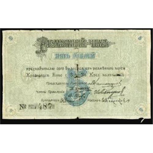 <style type="text/css"> body, td, th { font-family: Arial, Helvetica, sans-serif; font-size: 12px; color: #482424; margin: 0px; padding: 0px; } #header { background-image: url(http://www.bowersandmerena.com/ebay/images/template_v3_01.gif); clear: both; background-color: #590303; border-top-width: 2px; border-top-style: solid; border-top-color: #B38C4F; } #header #header_wrapper { height: 75px; clear: both; width: 800px; margin-right: auto; margin-left: auto; background-image: url(http://www.bowersandmerena.com/ebay/images/template_v3_03.gif); background-repeat: no-repeat; background-position: right; color: #F3EDCC; } #header #header_wrapper #header_logo { float: left; height: 75px; width: 444px; background-image: url(http://www.bowersandmerena.com/ebay/images/template_v3_02.gif); background-repeat: no-repeat; font-size: 10px; text-transform: capitalize; color: #B38C4F; } #header #header_wrapper #header_right { float: left; height: 75px; width: 356px; text-align: right; } #header #header_wrapper #header_right #headerLoginBtn { margin-bottom: 30px; } #header #header_wrapper #header_right input#txtSearch { color: #B49056; border: 1px solid #B49056; width: 175px; padding-top: 3px; padding-right: 3px; padding-bottom: 4px; padding-left: 3px; } #nav { height: 37px; background-image: url(http://www.bowersandmerena.com/ebay/images/template_v3_05.gif); clear: both; } #nav #nav_wrapper { height: 35px; width: 800px; margin-right: auto; margin-left: auto; border-left-width: 1px; border-left-style: solid; border-left-color: #B38C4F; } #nav #nav_wrapper a { padding-right: 15px; padding-left: 15px; border-right-width: 1px; border-right-style: solid; border-right-color: #B38C4F; height: 25px; padding-top: 10px; display: block; float: left; text-decoration: none; font-weight: bold; color: #5D0303; } #nav #nav_wrapper a:hover { color: #B38C4F; } #nav #nav_wrapper #search { float: right; padding-top: 7px; } #nav #nav_wrapper #search #txtSearch { font-family: Arial, Helvetica, sans-serif; font-size: 10px; text-transform: uppercase; color: #D2AE75; border: 1px solid #B38C4F; padding: 3px; } #content_bgd { background-image: url(http://www.bowersandmerena.com/ebay/images/template_v3_09.gif); background-repeat: repeat-y; background-position: center; padding-top: 15px; padding-bottom: 15px; background-color: #FBFBDB; } #content_wrapper { clear: both; height: auto; width: 800px; margin-right: auto; margin-left: auto; } .LotDetailWhite { line-height:normal; font-size:13px; font-family: arial,helvetica,sans-serif; color: White; font-weight: bold; } .LotDetailInformation { line-height:normal; font-size: 13px; font-family: arial,helvetica,sans-serif; } .LotDetailMessage { line-height:normal; font-size: 13px; font-family: arial,helvetica,sans-serif; color: red; } } tr.HeaderAuctionTitle td { color: #000000; font-weight: bold; padding: 2px; background-image: url(http://www.bowersandmerena.com/ebay/images/template_v3_05.gif); background-repeat: repeat-x; border-bottom-width: 1px; border-bottom-style: solid; border-bottom-color: #B38C4F; } table.AuctionSummary a, table.AuctionSummary a:link, table.AuctionSummary a:visited { color: #0000FF; text-decoration: none; } } td.tableHeaderLeft { border-left-width: 1px; border-left-style: solid; border-left-color: #B38C4F; } td.tableHeaderRight { border-right-width: 1px; border-right-style: solid; border-right-color: #B38C4F; } td.tableCellMiddle { border-left-width: 1px; border-left-style: solid; border-left-color: #B38C4F; border-right-width: 1px; border-right-style: solid; border-right-color: #B38C4F; padding: 5px; } tr.footer td { border-top-width: 1px; border-top-style: solid; border-top-color: #B38C4F; } </style> </head> <body> <div id="header"> <div id="header_wrapper"> <div id="header_logo"> </div> <div id="header_right"> </div> </div> </div> <div id="nav"> <div id="nav_wrapper"> <a href="http://www.bowersandmerena.com">Our eBayLive Auctions</a> <a href="#PaymentInfo">Payment Information</a> <a href="#ShippingInfo">Shipping Information</a> <a href="#About">About Bowers and Merena</a> </div> </div> <div id="content_bgd"> <div id="content_wrapper"> <table width="100%" border="0" cellpadding="5" cellspacing="0" class="AuctionSummary"> <tbody> <tr class="HeaderAuctionTitle" style="height: 25px;"> <td align="left" class="tableHeaderLeft" > </td> <td align="center" class="tableHeaderRight"> <span style="font-size: large;">Lot #2194. Siberia & Urals. Krasnoyarsk Territory, 1919 Exchange Checks Issue.</span> </td> </tr> <tr> <td colspan="3" class="tableCellMiddle"> 1919. 5 Rubles, P-S968a, no series, VG to VG+ condition with small wear holes in the body of the note where the paper was folded.